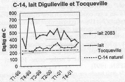 Données source Cogéma, conversion Bq/kg frais en Bq/kg de C Les installations agricoles proches de l'usine ont leurs pâtures polluées à hauteur de 1000 Bq/kg de C, cette pollution s'étend au delà du cercle des 2 km autour du site, en J8 (Vasteville) point situé à 10 km du site, la Cogéma a relevé 487 Bq/kg de C au 1er trimestre 2002 (250 Bq/kg de C au 3ème trimestre 2001). Comme le montre le graphique ci-dessus les retombées de C-14 sont très variables en fonction des rejets et des conditions météorologiques. (suite)