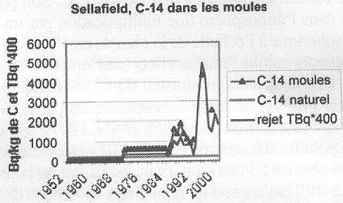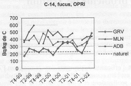 Il est recommandé (arrêté du 10 janvier 2003) à l'exploitant français de dériver le C-14 gazeux dans les prochaines années vers les rejets liquides (jusqu'à 48 TBq/an). Observons les taux actuels de C-14 dans l'environnement marin du site Cogéma avec le palier actuel de rejets en mer: 10 TBq/an depuis 1997. Comme pour l'environnement terrestre où les variations de taux de C-14 peuvent être mieux observées à partir d'échantillons prélevés régulièrement sur un site géographiquement pérenne: herbes et laits mensuels en un lieu donné par rapport à des données épisodiques variées (pommes de terre, poireaux, carottes, persil, …) sur des sites aléatoires (Omonville la petite, Jobourg, Herqueville, …), nous prenons le parti d'observer les données régulières en 3 points dans 2 supports : les patelles (Granville, Moulinets, Barfleur) et les fucus serratus (Granville, Moulinets,