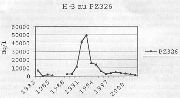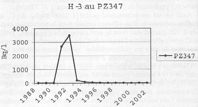 Avec les gestionnaires du CSM, cela devient une habitude, il vaut mieux connaître la réponse... avant de poser la question. En effet, l'efficacité du pompage dans la nappe au PZ328, puis en EVT7 est bien connue de l'Andra. Ses études hydrauliques du site(3) le soulignaient et l'intégraient dans leur simulation de modélisation de la nappe. Cette étude(3) situe l'arrêt de pompage au PZ 328 en avril 1990 et le début de reprise du pompage au point voisin EVT en juillet 1992, les courbes des pièzomètres 345 (fig 72) et 345 (fig 73) illustrent l'influence du pompage et de son arrêt dans les teneurs en tritium dans les piézomètres situés à proximité : augmentation d'un facteur 100 pour le PZ 345 et 5 pour le PZ 347, toutes les courbes des piézomètres 326 et ses proches vont dans le même sens. Nous avons repris les données Andra (2) en moyennes annuelles pour les pièzomètres 326 et 347, cette infuence du pompage est illustrée par les 2 graphiques ci-joints: