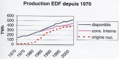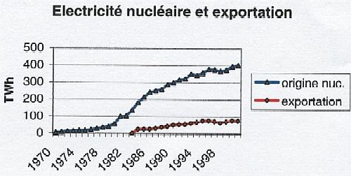 NB: les mines d'uranium françaises sont fermées, considérées comme non rentables par rapport aux gisements étrangers (Afrique, Canada, Australie). La notion “d'indépendance” avec un approvisionnement en matière première exclusivement externe est peut-être une notion discutable? I.2 - Par ailleurs, on oublie systématiquement de nous préciser que pour 395 TWh (TWh = 1.000 milliards de watt par heure) produits par nos 58 réacteurs en 2000, 69,4 TWh (17,6 %) ont été exportés (Italie, Allemagne, Grande Bretagne, …), soit la production de 10 réacteurs sur les 58. Nous avons donc actuellement une surcapacité de 10 réacteurs nucléaires, 2,5 pour l'Italie, 2,5 pour l'Allemagne 2,5 pour la Grande Bretagne et 2,5 pour la Suisse, l'Espagne et la Belgique. Par ailleurs sur les 48 dédiés à l'utilisation hexagonale, 4 centrales servent uniquement à l'enrichissement du combustible (Tricastin), combustible qui là encore n'est pas réservé au seul usage hexagonal : Tricastin fabrique plus du tiers de la production mondiale, l'équivalent du chargement de 100 réacteurs, soit encore presque 2 réacteurs dédiés à l'exportation. Ainsi, 12 réacteurs sur 58 soit 20,7 % du parc nucléaire français sont utilisés à d'autres fins que les seuls besoins énergétiques des français. Le fait d'exporter massivement de l'électricité, autorisation donnée formellement à EDF par le gouvernement de Michel Rocard, est une manière de contourner la loi de décembre 1991 (voir Article III) car l'ensemble des déchets, qui devraient être considérés comme des déchets provenant de l'étranger, restent ainsi sur le territoire français (avec les rejets et les démantèlements associés en prime).