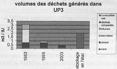 Graphique n° 3 Version Cogéma et CEA des déchets ultimes en 2002 (reprise d'un graphique publié par Cogéma en 1994, mais avec une erreur pour le stockage en l'état : 2 m3 /t d'U en 2002 au lieu de 1,5 m3 /t d'U en 1994) IV.1 - L'exploitant et son actionnaire