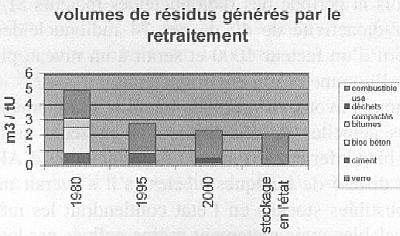 NB: Nous émettons de fortes réserves sur la réalité d'une telle réduction de volumes. En 1981 le groupe Castaing travaillait sur la base prévisionnelle de 4,5 m3 /t d'U sur les futures usines pour 20 m3 /an initiaux de déchets A. Selon le CEA (page 43 de la référence) le retraitement donnerait 100 volumes de déchets A pour un volume de déchets C, soit 11,5 m3 /t d'U de déchets A et non 1,4 m3 /t d'U comme annoncé par M. Ricaud … en 1994. Il n'y a pas eu d'examen critique de ces informations prévisionnelles de Cogéma datant de 1992 et reprises aujourd'hui sans justifications par le CEA et Cogéma. A partir des données Cogéma 1994, nous pouvons estimer le volume de déchets imputables au retraitement des combustibles étrangers dans chaque catégorie. Estimation des déchets étrangers fin 2002 (d'après 6): Déchets A : 1,4 x 9565 = 13.391 m3 Déchets B : 0,35 x 9565 = 3.348 m3 Déchets C : 0,115 x 9565 = 11/00 m3 Question: Que vaut une loi respectée au maximum à 6,7 % ?? (1.100 x 100 /17.839) Article IV Affirmation fallacieuse: l'uranium 238 confiné dans les combustibles stockés en l'état est omis dans le bilan des déchets ultimes engendrés par le retraitement et les surconteneurs des déchets vitrifiés pour stockage ultime sont “ oubliés ”. Nous reproduisons ci-dessous (graphique n° 3) le comparatif des déchets ultimes entre les 2 solutions retraitement et stockage en l'état publiés par la Cogéma et le CEA9