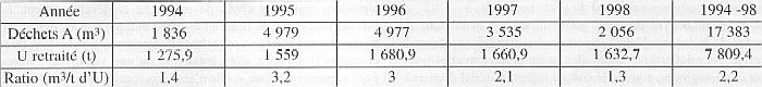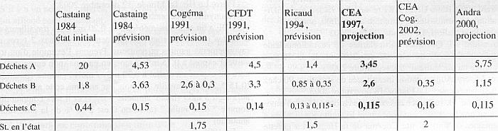 ![]() a) Comparaison des différentes données sur les déchets en fin de cycle (exprimées en m3 par tonne d'uranium dans le combustible initial) ![]() - Note de B. Lenail, Cogéma, Etablissement de la Hague, 2 mai 1991 - André Guillemette, dossier d'évaluation des déchets de fin de cycle pour l'UFSN CFDT, 5 juin1991 - M. Ricaud, directeur de la Branche retraitement de Cogéma, CSPI du 12 septembre 1994 - Conditionnement des déchets nucléaires, Denis Alexandre, Les déchets nucléaires, Société Française de Physique, Les éditions de physique, mai 1997. Données sur déchets en m3/GWé, déchets C: 4, déchets B: 90, déchets A: 120. Ramené au ratio et base déchets C: 0,115 m3 / t d'U - Informations utiles, Energy handbook, Edition CEA 2002, page 45 et Rapport environnement 2002, Cogéma-Etablissement de la Hague, page 29. A noter que ces données pour les déchets B et C sont identiques à celles fournies par M. Ricaud en 1994 dans “L'expérience de l'industrie du retraitement”, Cogéma, CSPI du 12 septembre. Ces données de septembre 1994 étant elles-mêmes la recopie de “ volume des résidus générés par t d'U dans UP3 ” dans “ Le retour du plutonium au japon ”, Cogéma, 5 octobre 1992 - Projection d'après informations Andra, page 38 du rapport de l'Office parlementaire38 , ratios pour la période 1998 à 2020 des différents déchets : Déchets C, 1; Déchets B, 10; Déchets A, 50. et hypothèse Cogéma de déchets C = 0,115 m3/t d'U. Ratio 1 à 10 conforté pour les déchets C et B par le CEA en décembre 200340 . p.28