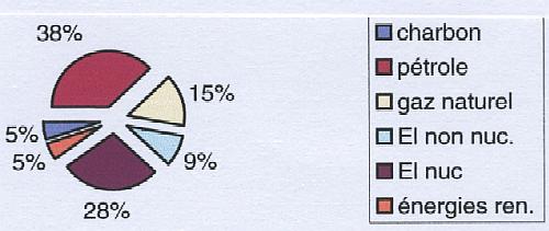 Source : Mémento sur l'énergie Energy data book, CEA, Edition 2001 Part des différentes énergies françaises en 2000 Lors du récent débat sur l'énergie organisé par le gouvernement français, l'association Global Chance partant des mêmes consommations que (CEA 2001) mais prenant en compte toutes les données comptables (rendements, consommation d'auxiliaires, …) ramène cette contribution de l'énergie nucléaire à 17 % (Global Chance 2003). (suite)