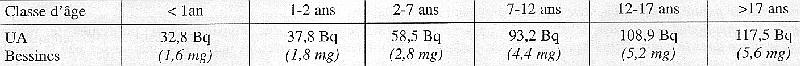 U238 99,8% ; U236 0,0003% ; U235 0,2% ; U234 0,001% (le total ne fait pas 100%) et correspond à une activité alpha de 14,9.103 Bq/g et une activité totale de 39,9.103 Bq/g). L'UA stocké à Bessines est moins appauvri que celui des munitions Pour la composition isotopique de l'UA du stockage autorisé à Bessines la composition est : U238 99,4865% ; U236 0,01% ; U235 0,50% ; U234 0,0035%. L'activité alpha est de 21,1.103 Bq/g et l'activité totale 46,3.103 Bq/g. Ainsi l'uranium stocké à Bessines est moins appauvri que celui des armes ce qui se voit facilement sur la concentration de U235. Il est aussi plus riche en radioélément U234 le plus radiotoxique, et aussi en U236. Dans l'Annexe I sont données les activités massiques en Bq/g pour chacun des isotopes U234, U235, U236, U238, (valeurs COGEMA), la contribution des différents isotopes à l'activité massique (alpha et totale) pour la concentration l'uranium appauvri de l'arrêté préfectoral. Nous indiquons aussi l'activité alpha et totale de l'UA des munitions étudié par l'IRSN et les données sur l'UA de la Royal Society. On peut voir ainsi que la contribution alpha de U234, radioélément le plus radiotoxique, est beaucoup plus importante dans l'UA de Bessines. Activité alpha et activité totale sont plus importantes pour l'UA stocké à Bessines que dans les munitions. La DRIRE considère-t-elle que l'uranium appauvri de Bessines qui est directement sous forme d'oxyde d'uranium en poudre (et peu soluble) est moins radioactif selon la version COGEMA et donc moins nocif que l'uranium appauvri des armements ? Et en plus il y a de l'U236… La présence de U236 et l'uranium issu du retraitement COGEMA a admis la présence de U236 dans les conteneurs, autorisé selon ses dires, par la réglementation commerciale internationale. (La législation française admet-elle que des règlements commerciaux puissent être invoqués pour justifier une pratique ?) En effet les conteneurs sont des conteneurs réutilisés et peuvent renfermer U236 en impureté. Or, s'il y a de l'U236 c'est la signature que par ce conteneur a transité de l'uranium issu du retraitement de combustible usé. On ne peut donc pas exclure la présence de traces de plutonium (Pu) et de produits de fission et d'activation. Que du plutonium puisse être présent dans l'uranium appauvri des armements cela a été reconnu par des officiels français de la radioprotection. Par exemple par Jean-François Lacronique, alors directeur de l'Office de Protection contre les Rayonnements Ionisants lors d'une interview par Marlise Simons publiée par le New York Times (17 janvier 2001) où il a déclaré “ Pour avoir un cancer par de l'uranium appauvri il faut avoir été exposé pendant longtemps à de grandes quantités. Mais l'U236 change l'équation car il provient du combustible usé qui a été retraité. Nous avons désormais le devoir de voir si d'autres contaminants du combustible usé sont présents tels que le plutonium ou l'américium qui sont beaucoup plus nocifs”. Mais qu'en est-il de l'uranium appauvri civil dont personne ne se soucie? Il se pourrait même qu'il y ait davantage de Pu dans l'Uranium appauvri (UA) provenant du retraitement des combustibles usés du nucléaire civil que de l'UA provenant des installations militaires car le combustible civil reste plus longtemps en réacteur! (suite)