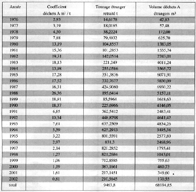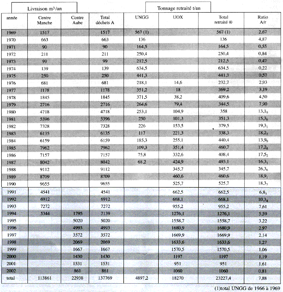Sigles: ACRO Association pour le contrôle de la radioactivité dans l'ouest ANDRA Agence nationale pour la gestion des déchets radioactifs CFDT Confédération française démocratique du travail Cogéma Compagnie générale des matières nucléaires CSDC Colis de déchets coques et embouts CSDV Colis de déchets vitrifiés CSPI Commission spéciales d'information près de l'établissement de la Hague Edf Electricité de France GRNC Groupe radioécologie Nord-Cotentin IRSN Institut de radioprotection et de sûreté nucléaire OPECST Office Parlementaire d'Evaluation des Choix Scientifiques et Technologiques UNGG combustible des réacteurs uraniun naturel graphite gaz dits de 1ère génération d'Edf UOX combustible standard des réacteurs à eau légère Déchets A Historique des déchets A engendrés par les usines de retraitement de Cogéma la Hague de 1966 à 2002 Tableau n°1