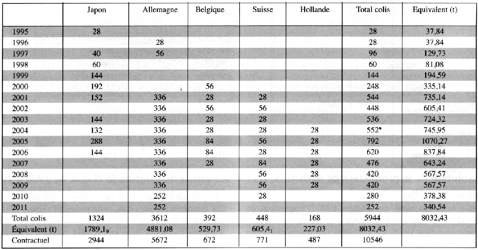 "Est interdit le stockage en France de déchets radioactifs en provenance de l'étranger ainsi que celui des déchets radioactifs issus du traitement de combustibles usés et déchets radioactifs provenant de l'étranger" (Art.L.542-2, Loi de programme relatif à la gestion durable des matières et des déchets radioactifs, texte n° 590, Assemblée Nationale, 15 juin 2006) Bilan résumé des retours prévus