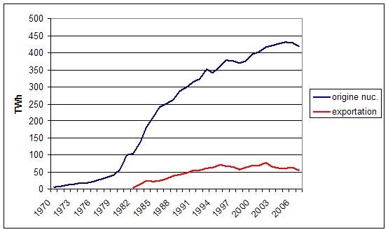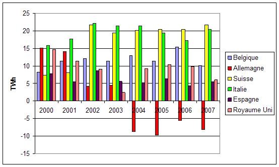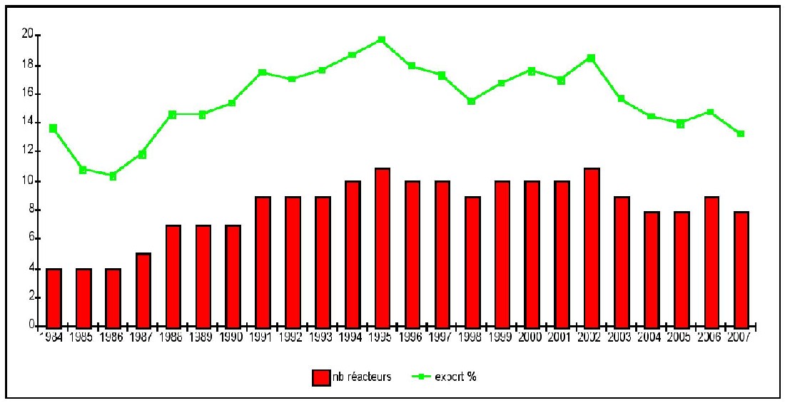 Dès 1984 apparaît une surcapacité équivalente à la production de 4 réacteurs. En part de la production d'origine nucléaire l'électricité exportée varie en 10 à 20% de cette production. Depuis 1991 le palier d'exportation varie entre l'équivalent production de 8 à 11 réacteurs. 2.2 Solde des échanges (un réacteur produit en moyenne 7,2 TWh/an - schéma 3): Schéma 3
