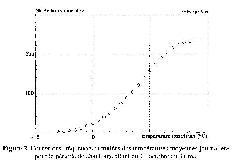 Figure 2 Courbe des fréquences cumulées des températures moyennes journalière pour la période de chauffage allant du 1er octobre au 31 mai L’information qui nous intéresse est