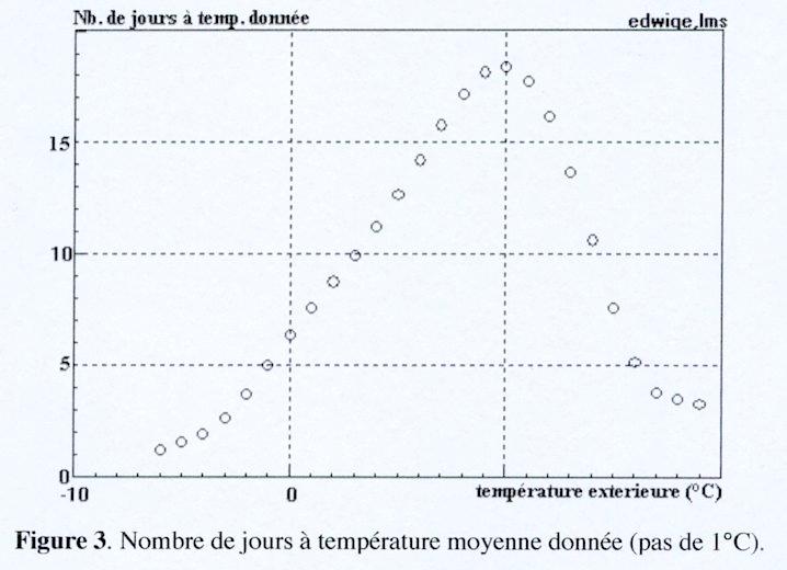 On en déduit facilement la Figure 3 qui représente le nombre de jours auxquels la température moyenne vaut une température donnée. Ainsi, la température est en moyenne égale à 0° seulement 7 jours par an. Cette courbe n’a pas un sens intrinsèque puisqu’elle dépend du pas de température choisi pour la calculer, mais elle est parlante et facile à utiliser dans les calculs qui suivent.