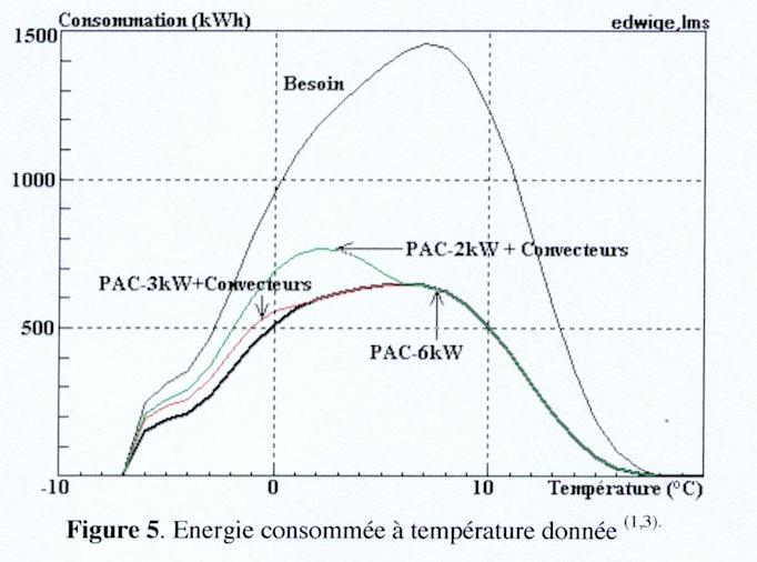 La réponse à cette question est donnée sur la Figure 5. On s’est intéressé à 3 types de PAC: une de puissance électrique (appelée au réseau) légèrement surdimensionnée – environ 6kW-, une de 3kW, et une de 2kW: