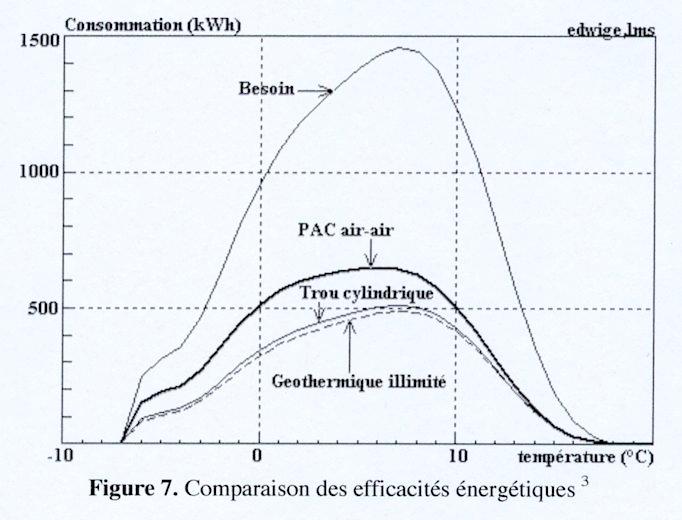 Figure 7 Comparaison des efficacités énergétiques3 Conductivité K: 3 W/m/°C (0.007 cal/s/m/°C)
