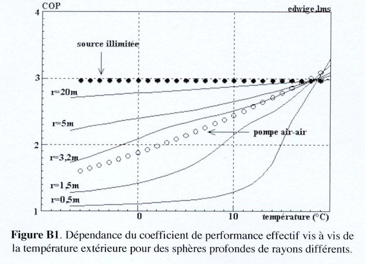 Même remarque que p.12... Cas de la PAC géothermique. Calcul de la température d’équilibre lorsqu’un flux de puissance donné – ce qui va être "pompé par la PAC – est extrait du sol. Pour une sphère de rayon a creusée dans un massif infini à température donnéee T= 0°C, on peut calculer l’évolution de la température au bord de la sphère en fonction de la puissance extraite. [2]. L’écart de température produit par un flux F est donné par la formule: a rayon de la sphère (en m) K coefficient de conduction de la roche (en W/m/°C) t (en s) [erfc: fonction d'erreur - aussi appelée fonction d'erreur de Gauss] Avec des valeurs réalistes de ces paramètres, on atteint 90% de la valeur d’équilibre (aF/K) en quelques minutes. À l’échelle du chauffage d’une maison, on peut donc raisonner avec la température d’équilibre. Pour la même sphère de rayon a et une puissance calorifique extraite P, on déduit de la formule: Avec ces hypothèses, on peut évaluer l’efficacité d’une PAC utilisant le forage géothermique comme source froide en considérant que la puissance extraite correspond à la puissance moyenne journalière. On donne la puissance P de la PAC et son coefficient de performance (COP ou Cop dans les formules), fonction de la température de la source froide. Pour une puissance nécessaire au chauffage Pch , la puissance à extraire du sol sera (Psol=Pch - P) avec (Pch=P.Cop). On suppose en effet que la puissance dissipée par la machine est intégralement récupérée. Pour un coefficient de performance Cop, on a alors: = Cop (qµ - (Pch- P) / 4p aK) On peut donc calculer le Cop effectif associé à une puissance de chauffage donnée, et ainsi à une température extérieure donnée. On utilise pour cela le Cop théorique de la PAC présenté Figure 1. Le résultat est représenté sur la Figure B1. Il figure le COP effectif du système – toujours pour la même maison de référence située en région parisienne – en fonction de la température extérieure (dont dépend directement la puissance nécessaire au chauffage).