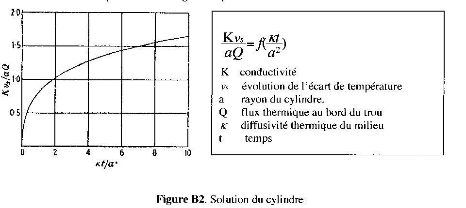 B1. Échangeur vertical La solution de l’échangeur en fond de puits ne présentant visiblement aucun intérêt, il faut considérer le cas où l’échange se fait sur toute la hauteur du puits. On considère que cette hauteur est de 80 m (pour un puits de 100 m) pour éliminer la couche supérieure du sol affectée par les variations saisonnières. Le problème théorique associé est celui d’une tranche horizontale infinie (qu’on suppose isolée sur ses deux faces) d’épaisseur 80 m dans laquelle un trou vertical est utilisé pour extraire de la chaleur. On trouve la solution de ce problème dans [2] sous la forme d’un résultat en variables réduites. Le résultat est présenté sur la Figure B2 pour une hauteur unité: On cherche la solution pour différents