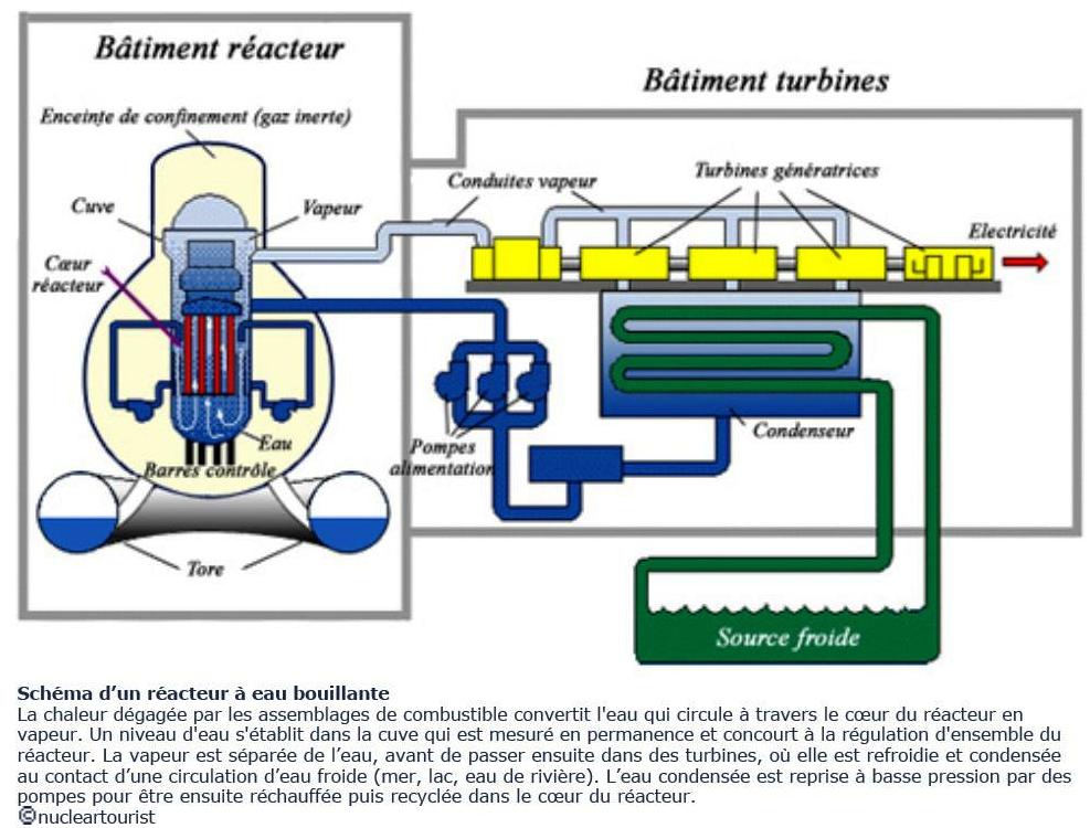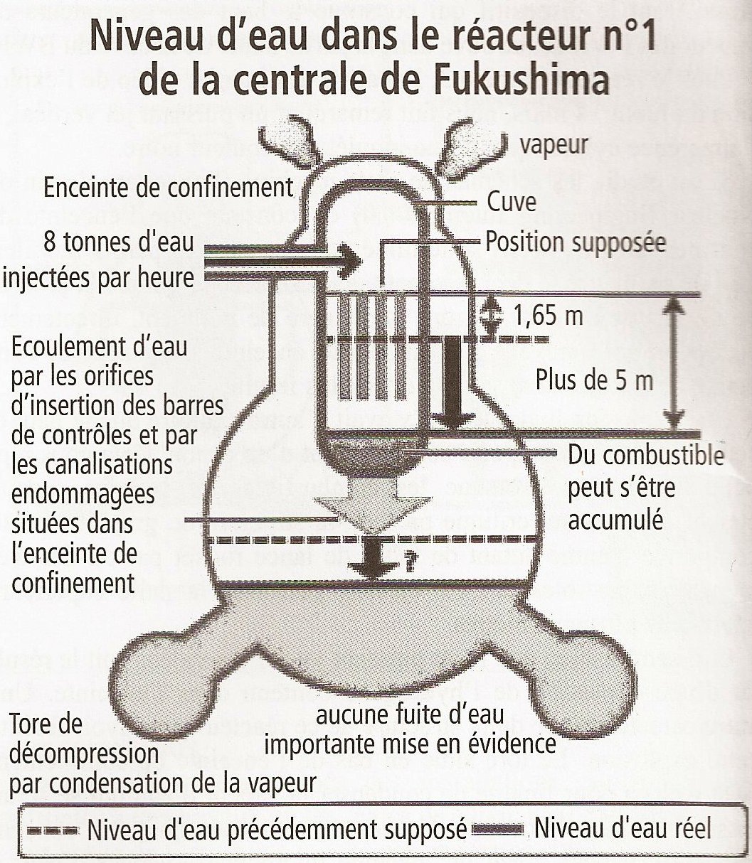 Les coeurs. Pour les coeurs, le problème est encore plus délicat. Il n’y a plus de moyen pour y envoyer de l’eau. Donc la pression monte, et suite au dénoyage du combustible, il y a production d’hydrogène. TEPCO nous dit avoir fait chuter la pression en faisant des largages. Par où? Un schéma fourni par AREVA explique que ce largage débouche... dans la zone supérieure du bâtiment réacteur, justement la zone où se trouvent les piscines. Cette explication nous paraît stupide car nous avons du mal à imaginer qu’un esprit tordu d’ingénieur va expédier un mélange de gaz explosif dans une enceinte fermée. Cela risquerait d’exploser en endommageant gravement le bâtiment. C’est pourtant ce qui s’est produit. Donc une autre hypothèse simpliste serait qu’il y a eu rupture d’une ou plusieurs des nombreuses canalisations qui sortent de la cuve du réacteur, puis traversent le béton de l’enceinte de confinement pour rejoindre divers auxiliaires et le groupe turboalternateur... ce qui pourrait expliquer l’abondante présence d’eau chargée de produits de fission dans ces bâtiments. Mais les coeurs des 3 réacteurs, partiellement dénoyés, ont commencé à fondre. De toute façon, lorsque l’oxydation des gaines est démarrée, celles-ci perdent leur tenue mécanique et ne résistent pas à la pression interne qu’exercent les gaz de fissions et les produits de fission volatils (Iode, Césium,...). D’où une dispersion des pastilles de combustible avant même qu’elles commencent à fondre. Des informations récentes concernant le réacteur numéro 1 nous ont appris que la mesure du niveau d’eau dans la cuve, dont l’estimation donnait un faible dénoyage du combustible... était coincée à la valeur mesurée au moment du séisme. Sacré Murphy, encore lui. Cela nous rappelle TMI où les opérateurs se fiaient à l’indication d’un voyant disant que la soupape responsable de la chute de pression était bien fermée... alors que le voyant indiquait que l’ordre de fermeture avait bien été envoyé, sans se soucier du fait que ladite soupape était bloquée en position ouverte. À Fukushima, après avoir envoyé des agents réparer la chose - question angoissante: à quel endroit ont-ils dû aller pour faire leur bricolage et quelles doses ont-ils prises? - il a bien fallu se faire à l’idée que le coeur était complètement dénoyé, donc fondu. Il semble bien que la cuve du réacteur numéro 2 se soit percée. La pression dans les BWR étant plus faible que dans les PWR, l’épaisseur de leurs cuves est plus faible. De plus les BWR ont la caractéristique d’avoir une injection des barres de contrôle par le fond de cuve. Ce qui donne une zone plus fragile. Rappelons que dans un BWR, la vapeur produite dans le coeur du réacteur est directement turbinée. Il n’y a pas un circuit secondaire comme dans les PWR. Aussi, tout le dispositif qui constitue le haut des générateurs de vapeur des PWR se retrouve dans la partie haute de la cuve du BWR. Pour le réacteur numéro 3, l’analyse des images vidéo de l’explosion du lundi 14 mars, nous fait remarquer un puissant jet vertical, à l’apparence cylindrique, d’une inquiétante couleur noire. Si on étudie les schémas de cette machine (l’excellent dessin de Nuclear Engineering International) on constate que l’enceinte de confinement (dry well) se termine en haut par des parois mobiles, afin de permettre le déchargement du coeur. Ceci explique la présence de la piscine dans la zone supérieure de bâtiment, directement accessible après noyage de haut de cette enceinte. Cette zone de l’enceinte de confinement semble donc plus fragile. Une explosion hydrogène n’y avait d’autre exutoire que le haut et cette enceinte se comporte comme le fût d’un canon. Cela nous rappelle Tchernobyl. Lorsque les combustibles de certains canaux étaient devenus sur-critique prompt, la structure de graphite s’était comportée comme autant de tubes de lance rocket par où des éléments combustibles ont été éjectés, perforant la dalle supérieure épaisse de plusieurs mètres. Et il semble bien que le jet puissant vu sur les vidéos soit le résultat d’une explosion de l’hydrogène contenu dans l’enceinte. Une autre caractéristique de la structure de ce réacteur peut avoir facilité cette explosion. Le tore situé en bas de l’enceinte de confinement (wet well) a pour finalité de condenser la vapeur d’eau qui se serait rassemblée dans l’enceinte. Ce faisant, en faisant chuter la concentration en vapeur d’eau du mélange hydrogène - vapeur d’eau, il améliore les conditions d’explosivité de l’hydrogène. Quant au réacteur numéro 4, qui avait la chance d’être déchargé, sa piscine contenait: 1 - le coeur fraîchement déchargé, c’est-à-dire dans l’hypothèse d’un renouvellement par tiers: un tiers avec un an de combustion, en second tiers avec deux ans de combustion et un troisième tiers avec trois ans de combustion... et les produits de fission correspondants. (suite)