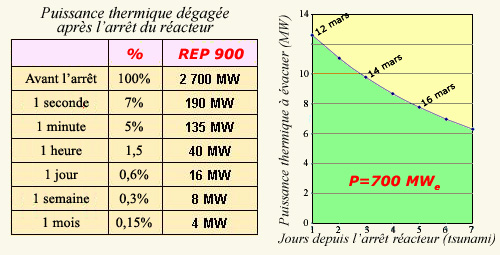 Arrive la vague du tsunami. Laissons au loin les controverses sur la hauteur de cette vague. Sa hauteur fut suffisante pour noyer les diesels, avec d’autant plus de facilité qu’ils étaient en sous-sol, ainsi de très nombreuses armoires électriques, de très nombreux moteurs divers et variés, dont ceux des pompes qui avaient résisté au séisme. Et ici nous n’énumérons que ce qui est noyé et non ce qui est détruit. Il est bien connu que lorsqu’un réacteur s’arrête, lorsque la réaction en chaîne est stoppée, les produits de fission continuent à se désintégrer produisant une quantité d’énergie qui, au moment de l’arrêt, est de l’ordre de 10% de la puissance nominale du réacteur... oui, mais de la puissance thermique, pas de la puissance électrique. Donc pour un réacteur produisant 500 MWé, cela fait 10% de 1.500 Mth... 150MWth... excusez du peu! Après une journée d’arrêt cette puissance résiduelle tombe à environ 1%, puis au bout de quelques jours, nous sommes à 1‰, et comme c’est une décroissance exponentielle, il est bien connu que cela va rester longtemps, très longtemps dans cet ordre de grandeur... 1,5 MW.