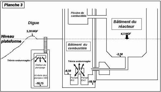 A ce moment-là: - Le réacteur est arrêté, mais il reste nécessaire d'évacuer la puissance résiduelle du coeur du réacteur due aux désintégrations radioactives. La puissance à évacuer est de l'ordre de 25 MW et le refroidissement est assuré par les générateurs de vapeur (GV), alimentés en eau par le circuit d'alimentation de secours des GV (ASG) comme il est normal quand un réacteur est arrêté; le circuit ASG comporte une réserve d'eau de 625 m3, deux motopompes et une turbopompe (une seule pompe suffit pour assurer le débit de refroidissement nécessaire). - L'alimentation électrique nécessaire au fonctionnement des matériels de la centrale est assurée par le réseau 400 kV, le réseau auxiliaire 225 kV n'est pas disponible. - La voie A du circuit d'eau brute secouru (SEC) est indisponible les moteurs des 2 pompes de cette voie étant noyés; les 2 pompes de la voie B sont disponibles (1 pompe suffit pour assurer les fonctions de ce circuit qui permet en particulier de refroidir les joints des pompes primaires mais aussi le circuit de refroidissement à l'arrêt (RRA) quand celui-ci est utilisé; - Les pompes du circuit d'injection de sécurité à basse pression (RIS) et les pompes du circuit d'aspersion de l'enceinte (EAS), utilisés en particulier en cas de brèche du circuit primaire pour refroidir le coeur du réacteur et évacuer la puissance dégagée dans l'enceinte de confinement, sont noyées et donc indisponibles, le fond du bâtiment du combustible où se trouvent ces pompes étant noyés sous 1,5 mètres d'eau; La conduite du réacteur consiste alors à dépressuriser et à refroidir le circuit primaire pour le mettre dans des conditions permettant, le cas échéant, la connexion au RRA, soit une température inférieure à 1.770°C et une pression inférieure à 32 bars. Ces conditions seront atteintes aux environs de 11 h, alors que la puissance résiduelle est encore de l'ordre de 20MW. (suite)