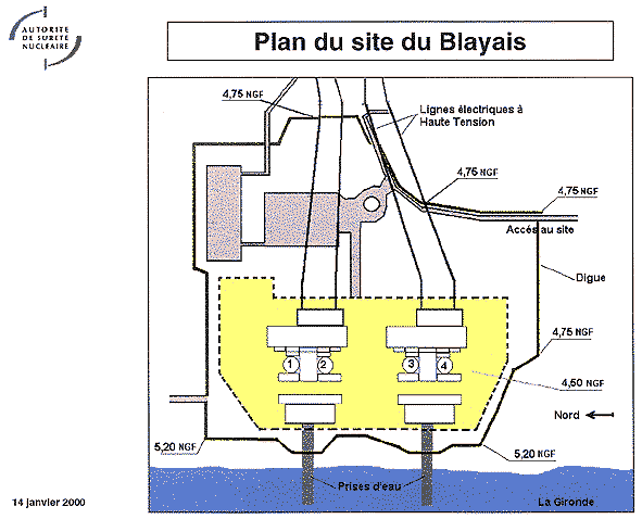 En clair, cela a rehaussé la plate-forme de 70 centimètres seulement côté Gironde et de 25 cm sur les côtés. On a vu le résultat lors de la tempête du 27 décembre dernier où des vagues sont passées par dessus cette "digue", inondant le site. D'après EDF, 90.000 m3 d'eau (90 millions de litres!) ont dû être pompés (et rejetés dans la Gironde). La masse d'eau infiltrée dans les galeries souterraines indiquées sur le schéma a conduit à la perte de matériels et circuits indispensables à la sûreté (perte totale des pompes d'injection de sécurité et d'aspersion de l'enceinte et perte partielle des pompes d'eau brute secourue). C'est un incident très grave qui aurait pu dégénérer en accident par défaut de refroidissement du coeur. [1] www.ipsn.frRapport sur l'inondation du site du Blayais survenue le 27 décembre 1999, IPSN, 17 janvier 2000 (12p. pdf). [2] NGF = nivellement général de la France. L'altitude zéro est définie par le plan d'eau à Marseille. Les altitudes sont données par rapport à ce plan pris pour référence. On a alors une altitude exprimée en mètres NGF. EXTRAIT du RAPPORT VD1 de Golfech 2 La protection contre les inondations externes