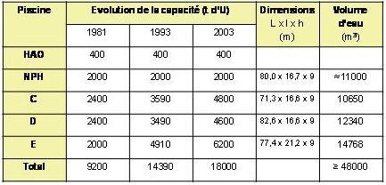 Température de l’eau des piscines: * 29 – 30°C en exploitation * 35°C, température maximale d’exploitation (Règles Générales Exploitation) * 40°C (piscine C) et 45°C (piscines D et E), température maximale de sûreté (prescription de sûreté) * 60°C Température maximale accidentelle admissible En cas de perte totale des fonctions refroidissement, le temps de découvrement des combustibles est de 7 jours avec le taux actuel de remplissage des piscines (9.721 t d’U mi-avril 2011 pour une capacité maximale de 18.000 t d’U – AREVA NC, CLI de la Manche du 18 avril 2011) Évaporation moyenne des piscines