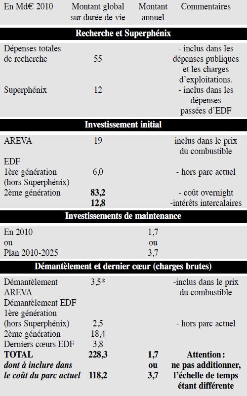3 - Des dépenses de démantèlement dont le montant ne peut être connu avec certitude Il faut rapprocher des investissements les dépenses de «fin de vie» des centrales, c'est-à-dire les dépenses de démantèlement des installations, que l’on peut compléter par les dépenses de «derniers cœurs». En ces dernières, comme les charges de démantèlement, ne sont dues qu’une fois, à la fin de vie de chaque réacteur. Dans les différents calculs de coût de production, ces dépenses sont bien prises en compte. Elles sont estimées aujourd’hui à 18,4 Md€2010, en charges brutes, pour le démantèlement des 58 réacteurs du parc actuel et à 3,8 Md€2010 pour les derniers cœurs. Le chiffrage du démantèlement repose sur une méthode historique simpliste, mais dont les résultats sont corroborés par des méthodes beaucoup plus élaborées, dont les paramètres techniques doivent toutefois êtres validés par des experts externes à l’entreprise. Les chiffrages actuels doivent être regardés avec précaution, l’expérience en la matière, tant d’EDF (centrales de 1e génération) que du CEA ou d’AREVA, ayant montré que les devis ont tendance à augmenter quand les opérations se précisent, et les comparaisons internationales donnant des résultats supérieurs aux estimations d’EDF. Toutefois, la grande dispersion des résultats de ces comparaisons internationales montre l’incertitude qui règne dans ce domaine. Récapitulatif des dépenses d’investissements ou assimilées