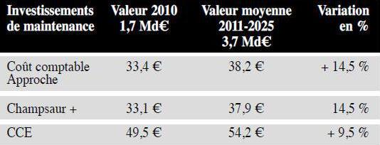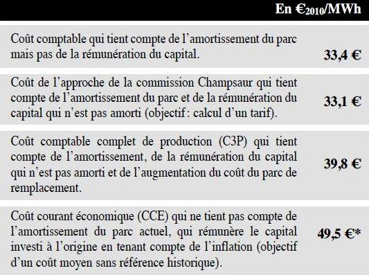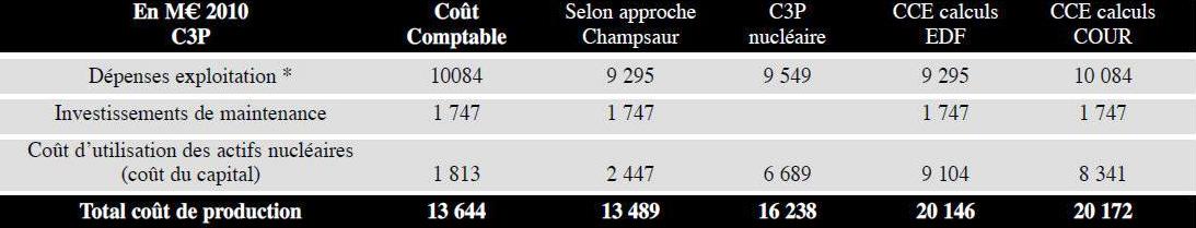 Les résultats des calculs et l’analyse des points de convergence de divergence sont présentés dans l’annexe 15 qui précise les modalités de calcul du CCE, du C3P et de l’approche de la commission Champsaur, les trois calculs étant appliqués à l’année 2010: - le coût comptable est le résultat de l’addition des dépenses d’exploitation validées par la Cour dans le calcul du CCE, des investissements de maintenance et d’un montant de 1.831 M€ représentant le cumul des amortissements 2010 (1.352 M€) et de la charge annuelle de démantèlement calculée par la Cour (461 M€); - concernant le CCE, l’annexe explique les écarts de méthode entre la Cour et EDF. Pour les charges d’exploitation, cet écart porte essentiellement sur la prise en compte des montants de désactualisation annuelle des provisions pour la gestion des combustibles usés et des déchets ; pour le coût du capital, la Cour n’intègre pas les charges futures de démantèlement dans le calcul du « loyer économique » mais les prend en valeur brute. Ces deux corrections de sens inverse sont de montants relativement équivalents; - concernant l’approche de la commission Champsaur, la Cour en fait une application à l’année 2010, alors que les chiffres, plus élevés, habituellement retenus et commentés sont ceux calculés en moyenne sur la période 2011-2025, qui intègrent un montant d’investissements de maintenance cohérent avec le programme d’EDF de 50 Md€ d’ici 2025, soit environ le double de celui de 2010. Le faible écart entre le coût comptable calculé par la Cour et le coût calculé par l’approche Champsaur est dû au fait que ce dernier ne prend pas en compte les charges de désactualisation, son objectif étant de calculé un tarif et non un coût brut comme le fait la Cour dans son calcul du coût comptable. Le tableau suivant reprend, exprimés en termes de coût par MWh produit, les résultats du tableau précédent. Ces calculs sont faits sur la base d’une durée de fonctionnement des 58 réacteurs du parc actuel de 40 ans et avec le montant d’investissements de maintenance réalisé en 2010, donc sensiblement inférieur à celui des années à venir. Résultats des différentes évaluations du coût