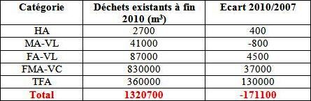 déchets produits à fin 2007 et ceux à fin 2010 sont