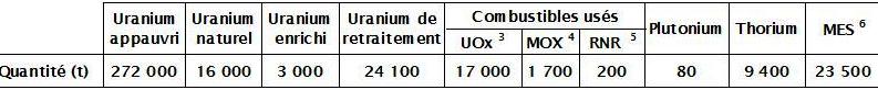 Les combustibles usés ne sont pas aujourd’hui considérés comme déchets, et ne sont donc pas conditionnés pour une prise en charge en stockage. Le volume moyen d’un assemblage combustible étant de 0,19 m3, ces assemblages représentent un volume de 12.000 m3. L’Andra a vérifié la faisabilité du stockage des combustibles usés en 2005. Les concepts de conteneurs de stockage utilisés pour cette démonstration induisaient un volume de colis de stockage d'environ 89.000 m3 (environ 7,5 fois plus que le volume non conditionné). Gestion de l’uranium de retraitement COMMENTAIRE GAZETTE Les tML sont rapportées au tonnage de combustible avant irradiation. C’est une façon de contourner le séjour en réacteur; ce peut être minorant ou majorant selon les cas et les radionucléides. En rajoutant une incertitude de 10 à 20% on doit se trouver dans la fourchette. Il s’agit également d’un inventaire qui repose sur les déclarations des exploitants: il y a aussi une incertitude bien que ce ne soit pas une bonne idée de «se tromper» dans les déclarations. Cependant, dans les estimations de l’ANDRA il est supposé que les 4 réacteurs de Cruas utilisent de l’uranium de retraitement enrichi: ceci sera vraiment possible avec le démarrage de Georgs Besse II qui se fait lentement. Quant aux 4e générations, il faudrait tout de même tout d’abord avoir discuté du programme énergétique à venir. Il est évident que si on se lance dans du nucléaire, la France aura loupé une fois de plus le coche. Il faut démarrer un programme alternatif maintenant. Ce programme reposera sur des économies d’énergie: arrêt du chauffage électrique par transformation des sources de chaleur accessibles, renforcement de l’isolation, ampoules basse consommation, réalisation d’appareils économes et réparables. p.6