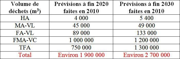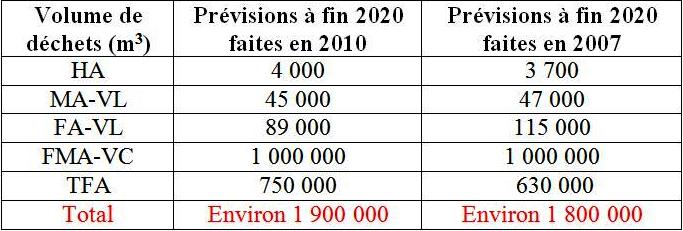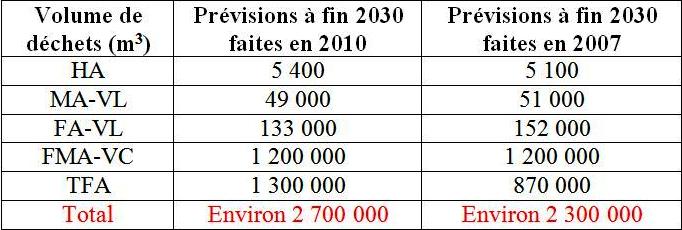 Ces prévisions ont évolué par rapport à celles publiées dans l’édition 2009 de l’inventaire national et rappelées ci-dessous. Les principaux facteurs de cette évolution sont: - une augmentation du flux annuel de retraitement de combustibles usés à l’usine de La Hague (1.000 tML au lieu de 850) avec tML défini comme suit: tonne de métal lourd soit tonne d’uranium ou de plutonium contenu dans le combustible avant irradiation. - la prise en compte d’une durée de fonctionnement supérieure des installations nucléaires (50 ans au lieu de 40 ans en 2007). - une meilleure identification des déchets qui seront produits par le démantèlement et les opérations de reprise de déchets anciens et une optimisation du tri, se traduisant notamment par des transferts de déchets de la catégorie MA-VL vers FA-VL ou FMA-VC et de la catégorie FMA-VC vers TFA, - le décalage de planning du démantèlement des réacteurs de la filière uranium naturel graphite-gaz, qui repousse la production des déchets FA-VL associés (déchets de graphite), - une augmentation conséquente du volume des déchets TFA due notamment à la prise en compte en compte des objectifs d’assainissement du génie civil des installations à démanteler, à des compléments de caractérisation de déchets considérés jusqu’alors comme pouvant être éliminés dans les filières conventionnelles et des transferts de déchets de la catégorie FMA-VC. Comparaison des prévisions faites en 2007 et 2010 é