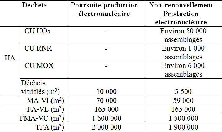 Dans ce scénario, le recyclage du plutonium est en effet limité à la fabrication du combustible MOX nécessaire au fonctionnement des réacteurs aujourd’hui autorisés à utiliser ce type de combustible. Au vu des dates d’arrêt de ces réacteurs, leur fonctionnement ne nécessite plus de séparer le plutonium par traitement des combustibles usés au-delà de 2019. Dans ce scénario, environ 28.000 tML de combustibles usés, UOx, RNR et MOX, deviennent des déchets et doivent être stockés (dans les mêmes conditions que les déchets HA). Estimation des déchets produits dans les 2 scénarios