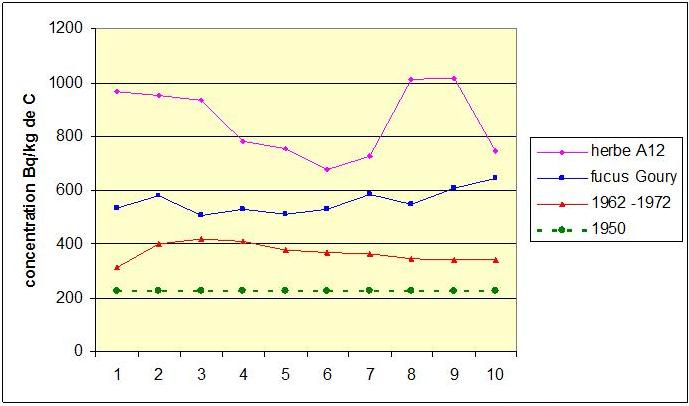 forme gaz carbonique [IRSN, 2001] et [Le Guen et Siclet, 2009]. Si l’on considère les 58 réacteurs français, ils ont un potentiel de rejet gazeux de l’ordre de 10 TBq/an, soit un rejet diffus à l’échelle de la France deux fois inférieur à celui du Centre de retraitement de La Hague: 20 TBq/an de rejet gazeux à l’échelle du seul Nord-Cotentin, et un rejet liquide global de l'ordre de 0,75 TBq/an, nettement inférieur aux 10 TBq/an de rejets liquides du site de retraitement AREVA NC dans les eaux du cap de La Hague. Le problème de La Hague est donc un très gros rejet local de carbone 14, tant aérien que marin, libéré principalement sous la forme de CO2 [IRSN, 2001]. Quelle est sa distribution dans le milieu proche? Jusqu’où s’étend son influence? Les mesures dans l’environnement imposées par l’OPRI à l’exploitant depuis 1997 et publiées chaque année par AREVA NC La Hague donnent l'image de la répartition spatiale de la pollution 14C dans la Nord-Cotentin, reste à en évaluer l'impact sur l'environnement et sur les populations exposées de manière réaliste. Alors que toutes les observations montrent un milieu terrestre proche du site (1 à 10 km) soumis à des activités comprises entre 450 et 1.000 Bq/kg de carbone 14 (supérieur de 100 à 300% par rapport à la radioactivité naturelle), et un milieu marin soumis à des activités comprises entre 600 et 700 Bq/kg de carbone 14 (supérieur de 150 à 200% par rapport à la radioactivité naturelle), l'exploitant propose un impact maximal calculé de 2 microSv quand toutes les données relatives au carbone 14 conduisent, a minima, à un impact dosimétrique annuel de l'ordre de 15 à 30 microSv dans un tel environnement. ![]() Sources: AREVA NC et [Roussel-Debet, 2006] Figure n°2: Le carbone 14 dans l’herbe au point A12, Jobourg/Herqueville et dans les Fucus serratus à Goury depuis 1998 (L’exploitant de La Hague surveille l’impact de ses rejets atmosphériques par des analyses d’herbe en plusieurs séries de points : points A distants de 1 km du site, B situés sur un cercle de 2 km de rayon … J situés sur un cercle de 10 km de rayon. Les rejets marins sont surveillés à partir de prélèvements côtiers d’algues et de patelles, la station de Goury est située à 5 km en aval hydraulique de l’émissaire de rejet des effluents liquides.) + influence des essais nucléaires atmosphérique dans les années 1962 -1972 et bruit de fond de l’année 1950.
