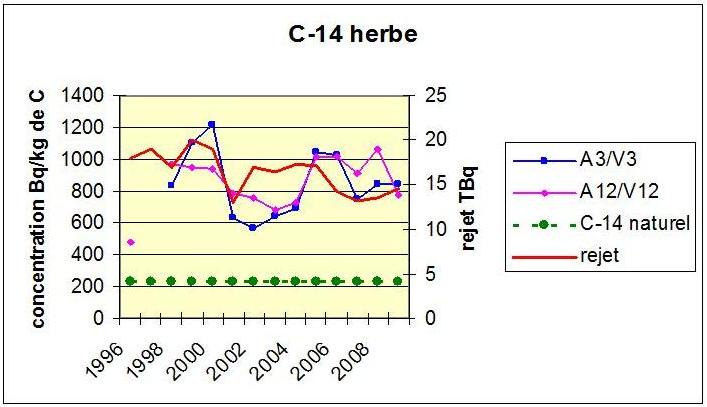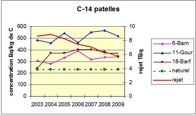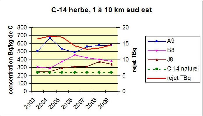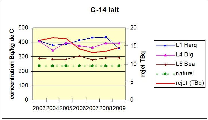 Hague (référence exploitant L5 Beau). p.13En 2008, le lait des deux exploitations sous vents dominants a un taux de 14C deux fois supérieur à la radioactivité naturelle, taux augmentant régulièrement depuis 2004, alors que les rejets aériens de 14C sont en régression depuis cette même date. Ces taux élevés de contamination en 14C sont aussi relevés dans les analyses ponctuelles de produits des potagers d’Herqueville publiées pour 2007 et 2008: