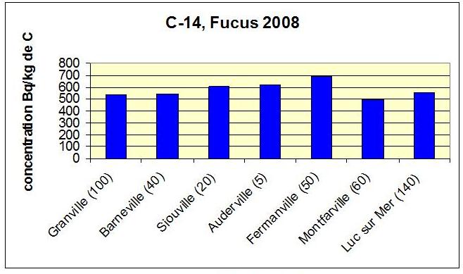 7) Cette progression continue du taux de 14C dans les fucus serratus de toutes les stations d'observation se traduit en 2008 par un taux de 14C supérieur à 500 Bq/kg de C de Granville à Luc sur Mer séparées de 240 km de côte, voir figure 9 ci-dessous: Pour les patelles (Fig.7) comme pour les fucus (Fig.8), la tendance actuelle est à l’augmentation de la contamination (400 à 500 Bq/kg de C) à Granville comme à Barfleur, (distance côtière de 160 km) contamination proche de celle des Moulinets (500 à 600 Bq/kg de C) auprès de l’émissaire marin. La pollution 14C de la zone maritime entre les stations de Barneville à Barfleur à hauteur de 600 Bq/kg de C est observable dans tous les bio indicateurs marins suivis à périodicité trimestrielle par AREVA NC (Fig. 9) dans les zones ouest (Agon-Coutainville / Goury) et nord (Goury / Barfleur), ou annuelle par l'IRSN (Tableau n°2) dans la surveillance de la rade de Cherbourg (En 2008, seule la matrice carrelets est observée dans la rade de Cherbourg 478 ± 83 Bq/kg de C [IRSN, 2009]). |