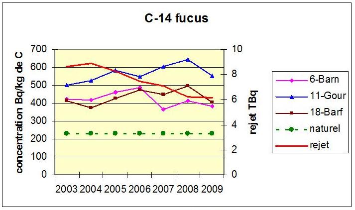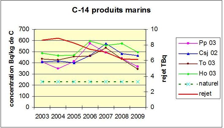 entre 1983 et 1985». [Beaujard, 1997]. (suite)Cette étude était basée sur un individu ne se nourrissant que de productions locales correspondant à un excès de 848 Bq/kg de C par rapport au bruit de fond, soit un taux de 14C total voisin de 1.000 Bq/kg de C (ibid). 1000 – 226 = 848 Bq/kg de C «artificiel». La dose calculée par McCartney était de 120 microSv/an, 48,2 microSv/an selon [Beaujard 1997]. Avec 300g de carbone par jour dans l'apport alimentaire, et un excès de 848 Bq/kg de C, on obtient un excès de dose de: 5,8.10-10 Sv/Bq x 848 Bq/kg x 0,3 kg/j x 365 j/an = 53,9 microSv/an À la suite de ces études, les autorités anglaises ont imposé à l’exploitant de réduire les rejets gazeux de 14C au-dessous de 8,4 TBq/an et les rejets liquides au-dessous de 20, 8 TBq/an à partir de janvier 1988. Depuis janvier 2003, AREVA NC La Hague est autorisée à rejeter jusqu’à 28 TBq/an dans l’atmosphère. Ces rejets atmosphériques pouvant être dérivés vers les rejets liquides. Dans cette dernière option, la valeur des rejets peut être de 42 TBq/an (gazeux 28 TBq + liquides 14 TBq). En résumé, nous pouvons dire que: * Le panache de pollution 14C terrestre, comprise entre 600 et 1.000 Bq/kg de C, est observable dans tous les compartiments: herbe, lait et produits des potagers individuels, dans les zones de 1 à 2 km sous le vent du site de La Hague. * Ce panache de pollution se prolonge au-delà du point de prélèvement situé à 10 km du site (J8), à hauteur de 400 Bq/kg de C. * Les rejets marins ne sont autorisés qu’à certaines heures de marée, pour permettre une dilution plus efficace des radionucléides. Une méthode de réduction significative de l’impact des rejets gazeux de 14C serait de ne les autoriser que la nuit : la photosynthèse ne se produisant qu'à la lumière du jour, cela éviterait l'absorption des effluents 14C dans les plantes de la flore terrestre lors de l'assimilation foliaire du carbone. Voir «Mobilité et biodisponibilité en milieu terrestre» dans la fiche carbone 14 de l'IRSN, [IRSN, 2001] et l'analyse IRSN du rejet atmosphérique non autorisé de l'usine SOCATRI [Roussel-Debet, 2008] (Rejet atmosphérique de 2,26 GBq en juillet – août 2008). La Hague a rejeté 13.500 GBq en 2008. 2.3 Les rejets liquides de carbone 14 2.3.1 Le carbone 14 dans l’environnement marin du site de la Hague Observons les taux actuels de 14C dans l’environnement marin du site AREVA NC avec le palier actuel de rejets en mer : de 7 à 10 TBq/an depuis 1996. |