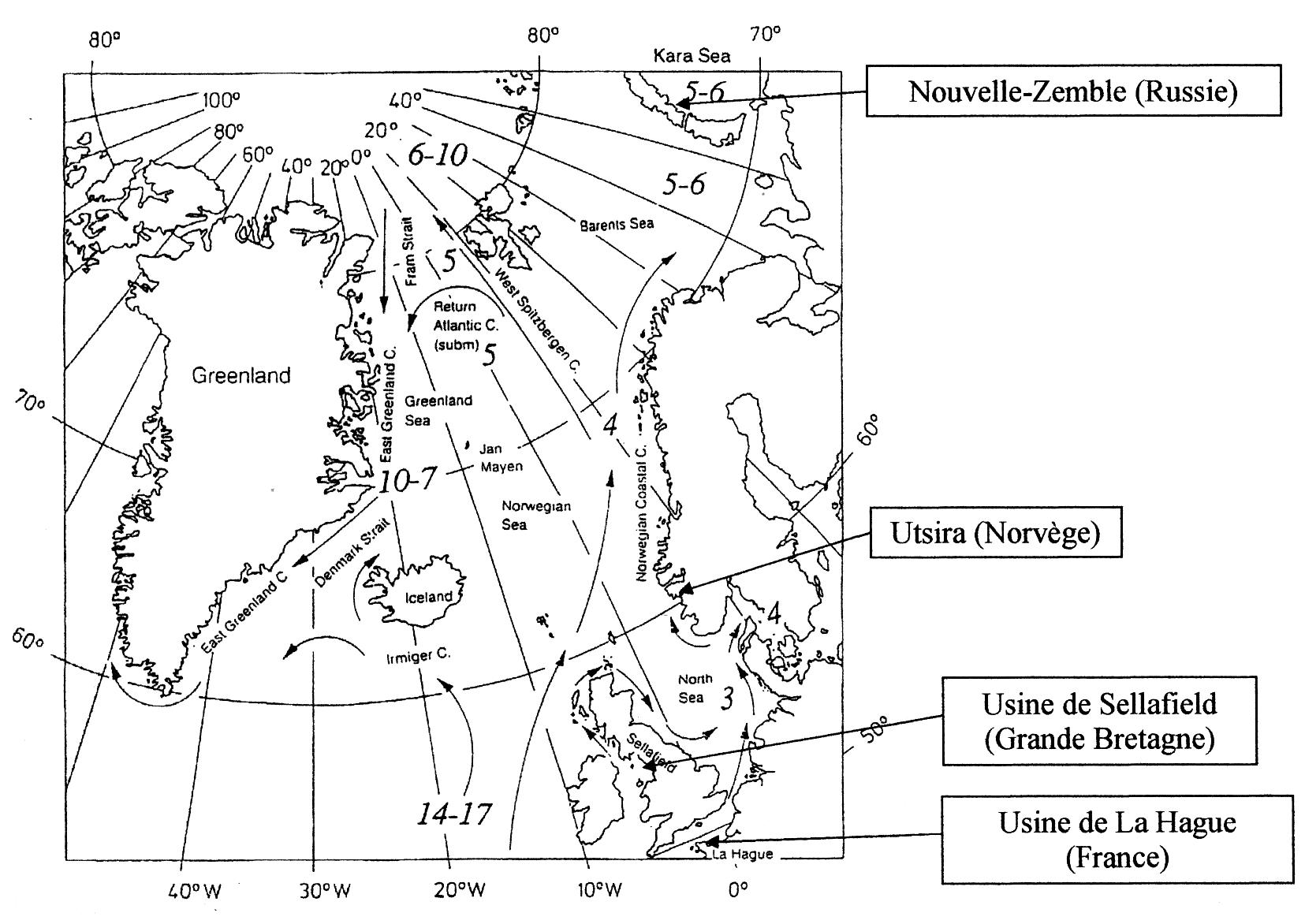 mer a toujours été en moyenne proche de 1,9.105 à La Hague comme à Sellafield. À Tokai Mura, de 2000 à 2002, ce même rapport 85Kr/129I a été de 3,1.108, soit un rejet marin 1.600 fois inférieur à celui des usines de La Hague et de Sellafield, à potentiel de rejet égal. p.122- Développement 2.1 Généralités Caractéristiques de l’iode 129 (129I) : Période radioactive 15,7 millions d’années (± 0,4.106 ans) Émissions électrons, bêtas, X et gammas et Coefficient de dose effica- ce adulte, par ingestion: 1,1.10-7 Sv.Bq-1 Rappels métaboliques L’iode ingéré est rapidement et presque complètement transféré du tractus gastro-intestinal vers le sang. L’iode inhalé est transféré au sang dans une proportion de 63%. Une fraction de l’iode (30%), transférée au sang est fixée par la thyroïde sous forme de tétra-iodothyrosine (l’hormone thyroïdienne = thyroxine). Le reste est excrété (urines, fèces). L’iode fixé par la thyroïde en est éliminé sous forme organique avec une période biologique de 120 jours. Cet iode organique, produits de dégradation de la thyroxine (tri-iodo, di-iodo et mono-iodo thyrosine), se répartit uniformément dans tous les organes et tissus où il est retenu avec une période biologique de 12 jours. Un dixième est excrété par voie fécale. Le reste retourne au sang sous forme minérale d’où il est recyclé vers la thyroïde. [Vilquin, 1985] 2.2 Origines de l’iode 129 L’iode 129 naturel est créé par fission spontanée de l’uranium 235 qui est le seul isotope fissile de l’uranium naturel (masse 235U, 0,71% de la masse de l’U naturel). L’OMS et l’IRSN ([OMS, 1987], [IRSN, 2001]) estiment à 7 GBq le stock d’129I accumulé sur la terre au niveau des océans depuis les quelque 5 milliards d’années de son existence. L’iode 129 est aussi créé artificiellement lors des réactions de fission des noyaux d’uranium ou de plutonium fissiles. Les explosions atmosphériques d’armes nucléaires dans les années 1945-62 ont libéré dans l’environnement terrestre une activité d’129I estimée à 400 GBq [ibid.]. Les réacteurs nucléaires créent une quantité d’129I estimée à 75 GBq par cycle de combustibles (tous les 4 ans environ) pour un réacteur à eau pressurisée de 1.300 MWe. Cet iode 129 reste prisonnier du combustible et de sa gaine lors du déchargement et du stockage, mais il peut être libéré presque totalement dans l’environnement lors d’opérations de retraitement des combustibles irradiés. Ces opérations de retraitement sont pratiquées par les usines de Sellafield et de La Hague. Des années 1960 à 2009, ces usines ont rejeté dans l’environnement respectivement des quantités et des rapports atmosphère/mer très différents: Sellafield: rejets gazeux 1.980 GBq, rejets liquides 7.250 GBq, (soit 21,5% et 78,5%) La Hague: rejets gazeux 495 GBq, rejets liquides 25.400 GBq, (soit 1,9 % et 98,1%) La période très longue de ce radionucléide est une caractéristique utilisée dans le suivi des mouvements d’eau de l’Atlantique Nord et de l’océan Arctique à partir des points de rejet de Sellafield et de La Hague (Fig. n°1). Figure n°1 ![]() Flux et temps de transit des radionucléides rejetés dans les effluents liquides des usines de La Hague et de Sellafield [Guéguéniat et al., 1996] Sources: Dahlgaard, 1994 Rejets d’iode et environnement L’iode rejeté dans l’environnement par voie atmosphérique se dépose sur le sol où il est intégré dans la chaîne alimentaire: transfert air => plante, transfert herbe => lait de vache => homme. L’iode rejeté en eau douce est susceptible de contaminer les cultures irriguées, les poissons et l’eau de boisson. L’iode rejeté en mer et celui qui est rejeté dans les fleuves sont susceptibles de contaminer les poissons, crustacés et mollusques. Il demeure longtemps dans la couche superficielle bien mélangée des océans. Les échanges avec les couches profondes sont très lents. |