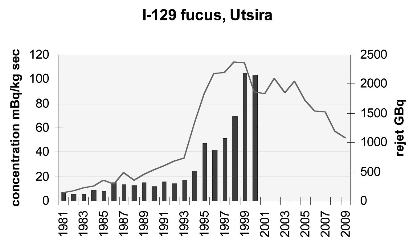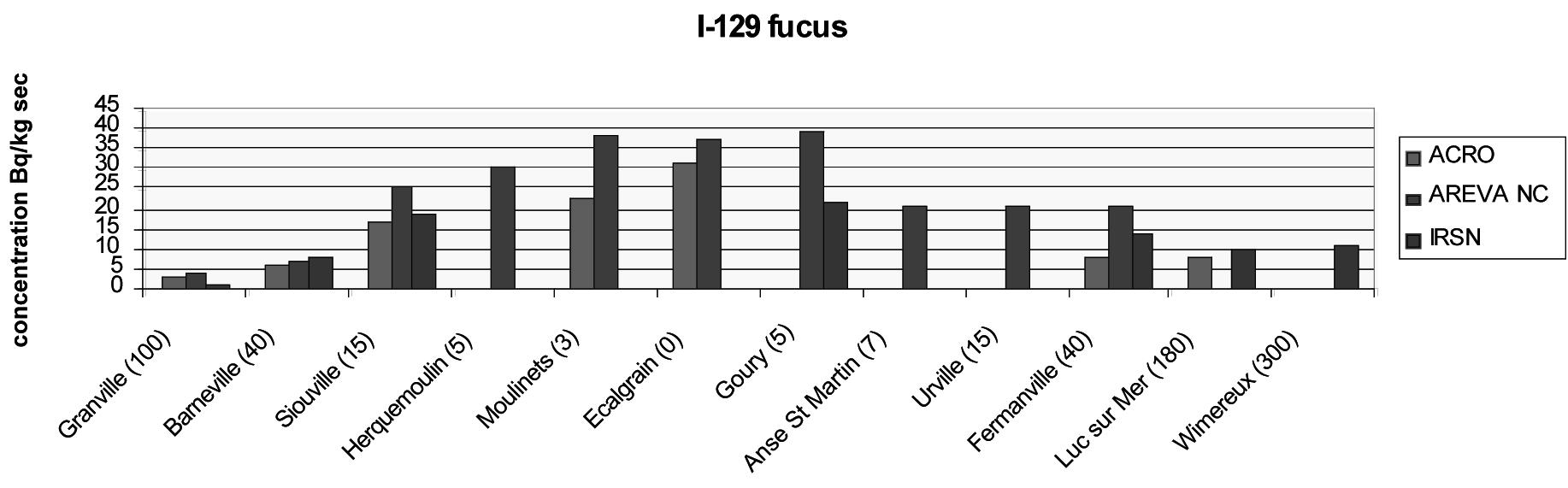 brunes sur les côtes françaises en champ lointain du point de rejet (180 à 300 km) Sources: Patti et al., 1998, Raisbeck et al., 1994, Maro et al., 1999, AREVA NC, et RNM En champ lointain, 180 à 300 km du point de rejet, si l’on compare les quelques données bibliographiques aux données publiées récemment par le RNM, ces dernières montrent une progression des taux d’129I dans les algues brunes, alors que les rejets sont en diminution depuis 2000. En champ proche, 5 km en aval hydraulique du point de rejet, sur la station de Goury, la contamination moyenne annuelle des Fucus serratus fluctue avec le rejet (Fig. n°7), la valeur maximale étant atteinte en 1999 avec les rejets maximaux enregistrés: 68 Bq/kgsec pour 1.830 GBq rejetés (Donnée AREVA NC: moyenne 129Idans les Fucus serratus de 2003 à 2009, exprimée en Bq/kgfrais et transformée en Bq/kgsec, voir conversions § 2.3.1.) Figure n°7 ![]() Concentrations moyennes d’iode 129 dans les Fucus serratus à Goury Sources: Patti et al., 1988, Zhou et al., 1995, et AREVA NC Sur la période 2000-09, et pour la zone d’observation Granville - Barfleur, 520 analyses de Fucus serratus et 520 analyses de patelles ont été pratiquées par un même laboratoire agréé. Les patelles ont un taux de contamination moyen 30 fois inférieur à celui des Fucus serratus, teneurs moyennes comprises entre 0,5 et 2,5 Bq/kg-sec (voir Fig. n° 8). D’autre part, la concentration d’129I dans les fucus est dix fois inférieure à celle attendue à partir de la détermination de l’129I dans l’eau de mer prélevée au même instant sur la même station, voir fiche sur les facteurs de concentration (Fc) iode en annexe. Le Fc générique de 10.000 entre teneur iode dans l’eau de mer et teneur iode dans les algues n’est pas applicable à toutes les algues. [Maro et al. 1999] relèvent des taux d’129I dans Laminaria digitata 12 fois supérieurs à ceux mesurés dans Fucus serratus, pour une même station. |