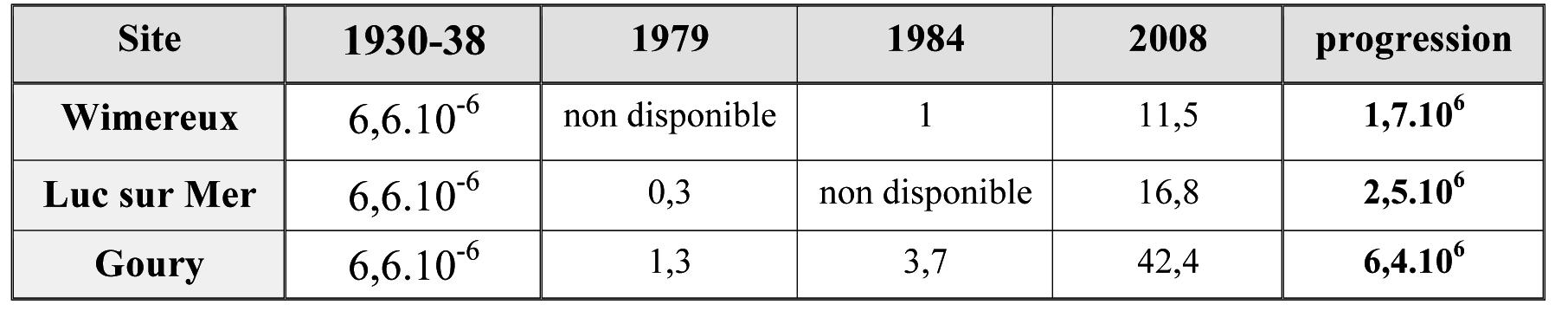 située sur la côte nord-ouest de l’Irlande, où le taux d’129I a progressé d’un facteur 2,4.105 de 1930-38 à 2003: (suite)2.3.2 Données environnementales, côtes françaises de la mer de la Manche et zone maritime proche du site AREVA NC de La Hague Figure n°4 L’observation de l’iode 129 dans les algues Fucus serratus