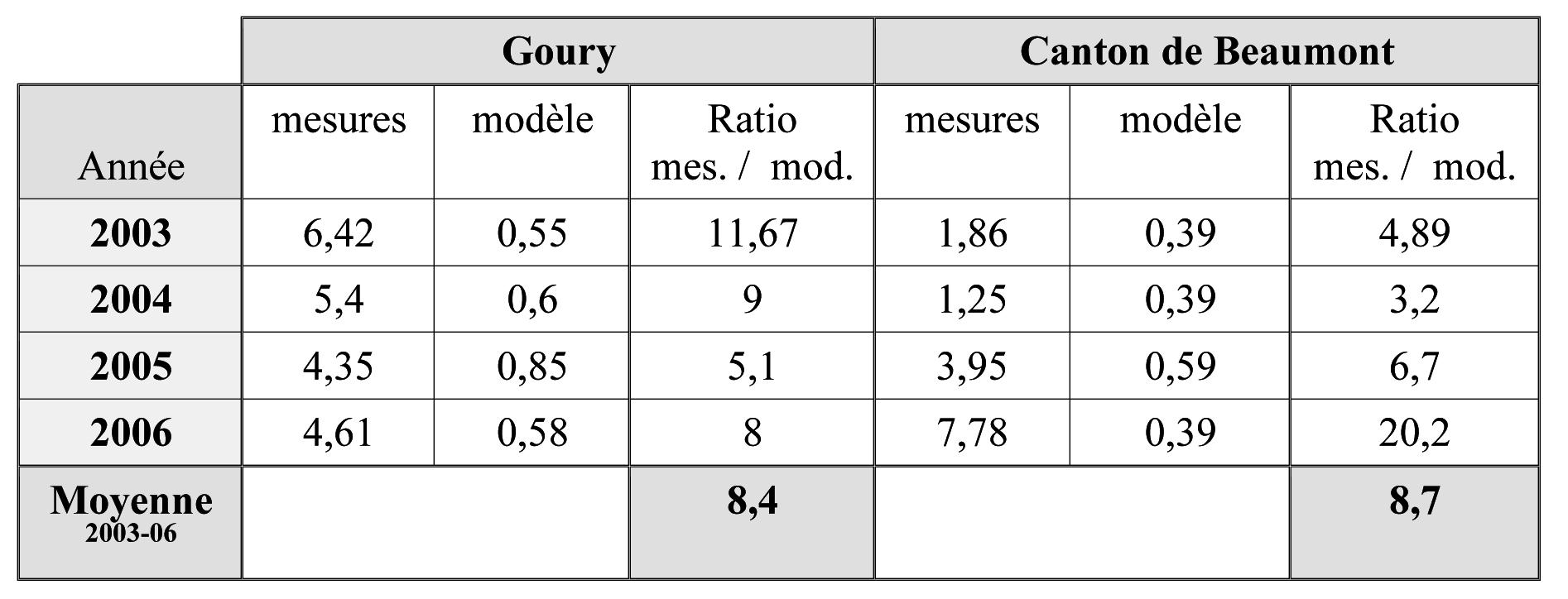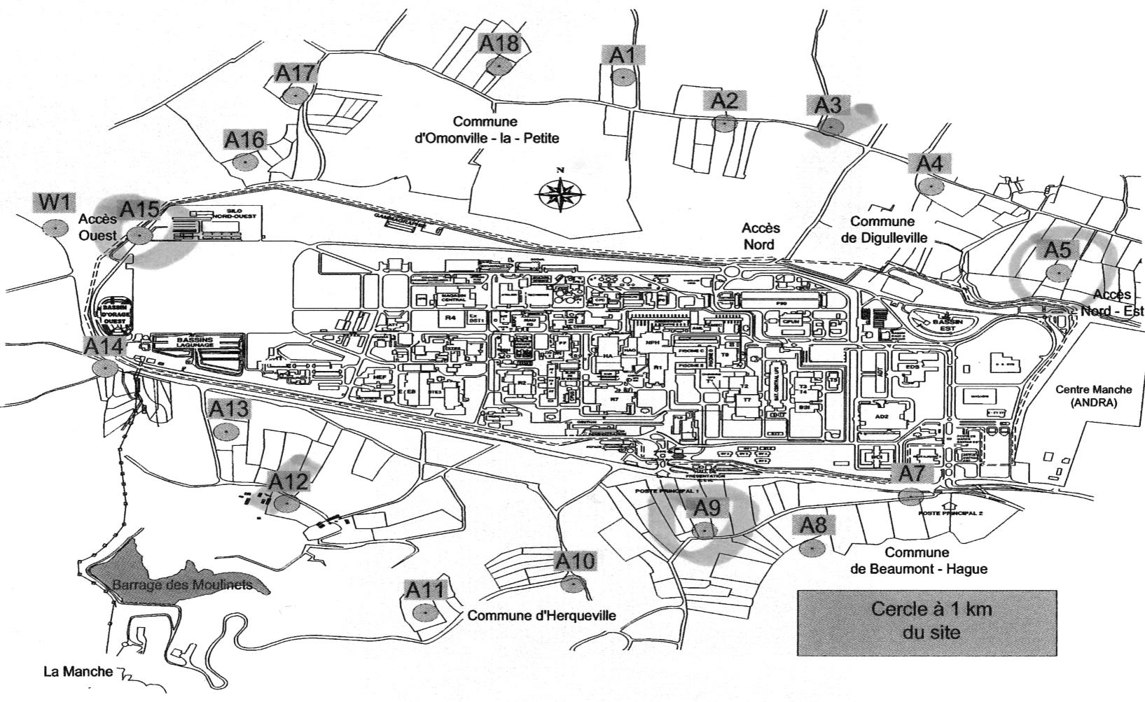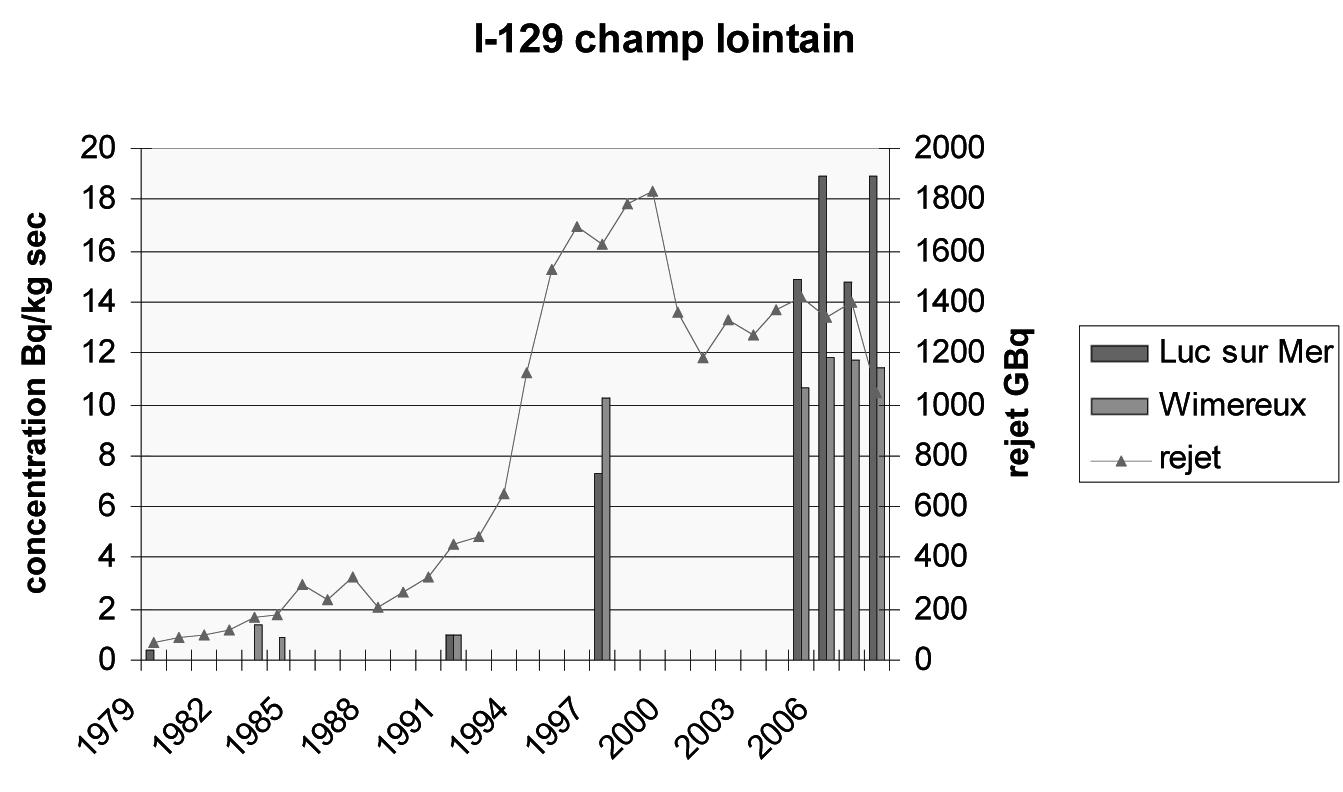 point situé à 10 km font l’objet de prélèvements trimestriels. p.16Les points A3 et A12 ont toujours eu des mesures significatives depuis 1999. Les observations ci-après sont basées sur la permanence du suivi de ces deux points. Les taux moyens annuels d’129I aux points A3 et A12 varient de manière synchrone, sans liaison directe avec le rejet pour les 11 années observées (voir Fig. n° 13). Des taux significatifs d’129I peuvent aussi être observés sur quelques échantillons de «productions agricoles » à Herqueville, commune située à 1 - 3 km au sud du site: 1,5 à 4,5 Bq/kgsec (persil, herbes aromatiques, lapin, œufs), [AREVA NC, 2007-09]. 2.4.2 Données environnementales dans le lait, exploitations proches du Site de La Hague Début 1995, dans un courrier adressé à la Commission d’information de la Hague (CSPI - Courriers du 14 avril et 2 mai 1995, adressés par André Guillemette membre du collège syndical au Docteur Albert Collignon, conseiller scientifique de la CSPI), nous nous étonnions que les mesures dans le lait des exploitations agricoles jouxtant le site de La Hague soient indiquées sous la forme « <13 Bq/l à <19 Bq/l ». L’arrêté du 27 février 1984 fixait la limite de rejet des halogènes (129I, 131I et 133I) à 111 GBq/an et l’129I constitue de l’ordre de 98 % des rejets halogénés. Selon l’étude d’impact du site de La Hague de 1983, 111 GBq/an d’iode 129 auraient eu un impact de 1,3 Bq/l dans le lait des exploitations voisines du site, situées sous les vents dominants. (avec) Un seuil de mesure 10 fois plus élevé que le taux attendu avec un rejet au maximum de l’autorisation, nous émettions quelques doutes sur la pertinence de la mesure dans ces conditions. En janvier 1996 l’exploitant a baissé sa limite de détection d’un facteur 10 en augmentant le temps de comptage des échantillons [CSPI, 1996]. Aujourd’hui, cette limite de détection est encore abaissée pour se situer dans la fourchette 0,02 – 0,07 Bq/l, mais elle ne permet pas de déterminer la situation réelle de l’129I dans les exploitations proches. Si l’on prend l’exemple du lait des exploitations L1 (Herqueville) et L4 (Digulleville) de 2003 à 2009, l’129I fait l’objet de 46 mesures significatives pour 144 échantillons. L’IRSN dans ses rapports annuels sur l’environnement rapporte une mesure moyenne de 0,013 Bq/l en 2008 du lait de «Beaumont» et de 0,021 Bq/l en 2009. Ces 46 déterminations significatives d’129I peuvent néanmoins être comparées aux rejets mensuels supposés les avoir engendrées. L’impact moyen est de 0,08 Bq/l/GBq, avec des valeurs extrêmes comprises entre 0,02 et 0,15 Bq/l/GBq. Ces valeurs étant à comparer avec la donnée calculée dans l’étude d’impact de 1983: 0,14 Bq/l/GBq, (1,3 Bq/l pour un rejet moyen de 9,25 GBq/mois). |