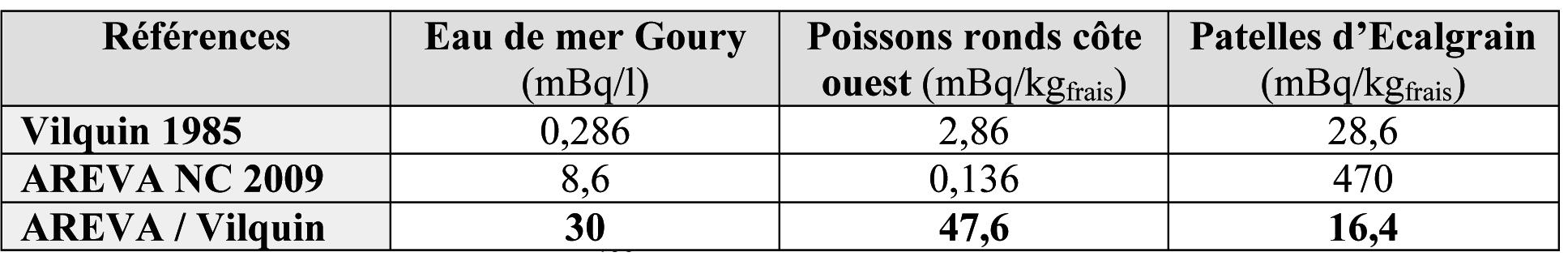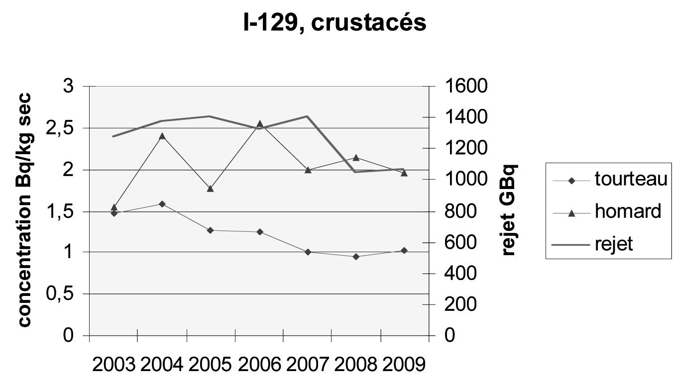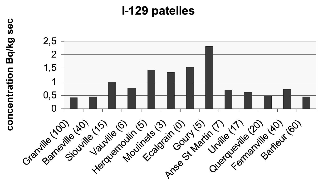 Source: AREVA NC Concentrations moyennes d’iode 129 dans les patelles entre Granville et Barfleur, période 2003-09. ( ) = distance côtière du site par rapport au point de rejet, en km Le taux d’129I observé dans les patelles, bio-indicateur à prélèvement trimestriel, présente les mêmes valeurs que celles observées chez les crustacés de la zone «côte ouest»: 1 à 2,5 Bq/kgsec (voir Fig n°9). Figure n° 9 ![]() Concentrations moyennes d’iode 129, dans les crustacés de la «côte ouest», Période 2003-09 (prélèvements trimestriels) Source: AREVA NC Dans la suite de l’étude, en l’absence de donnée 129I dans l’eau de mer, nous prenons le taux d’129I dans les fucus comme base de calcul du taux d’129I dans les mollusques et crustacés: Fc 30 entre mollusque-crustacés et fucus, et Fc 10 entre et mollusques-crustacés (Fc 100 mollusques-crustacés et Fc 10 poissons par rapport à l’eau de mer, GRNC et Vilquin). Eau de mer, poissons et patelles dans la zone de rejet L’étude de Vilquin est basée sur une dilution dans la zone de rejet (face à l’anse d’Ecalgrain) de 1.10-5 Bq/l d’129I pour un rejet de 37 GBq (§ 4.2 de [Vilquin, 1985]), les facteurs de concentration en iode étant de 10 pour les poissons et 100 pour les mollusques et les crustacés. Si nous prenons la situation 2009 publiée dans le rapport annuel environnement AREVA NC, les valeurs observées dans l’eau de mer à Goury (10 et 7,2 mBq/l, soit une moyenne ≈ 8,6 mBq/l), chez les poissons ronds de la côte ouest (0,1; < 0,045; 0,19 et 0,21 Bq/kgfrais, soit une moyenne ≈ 0,136 Bq/kgfrais) et chez les patelles d’Ecalgrain (0,47 Bq/kgfrais), ne correspondent pas aux valeurs attendues pour un rejet marin de 1.060 GBq en 2009: 1.10-5 x 1.060 / 37 = 0,000286 Bq/l, soit 0,286mBq/l dans l’eau de mer Soit des valeurs attendues de 2,86 mBq/kgfrais chez les poissons et de 28,6 mBq/kgfrais chez les mollusques et les crustacés |