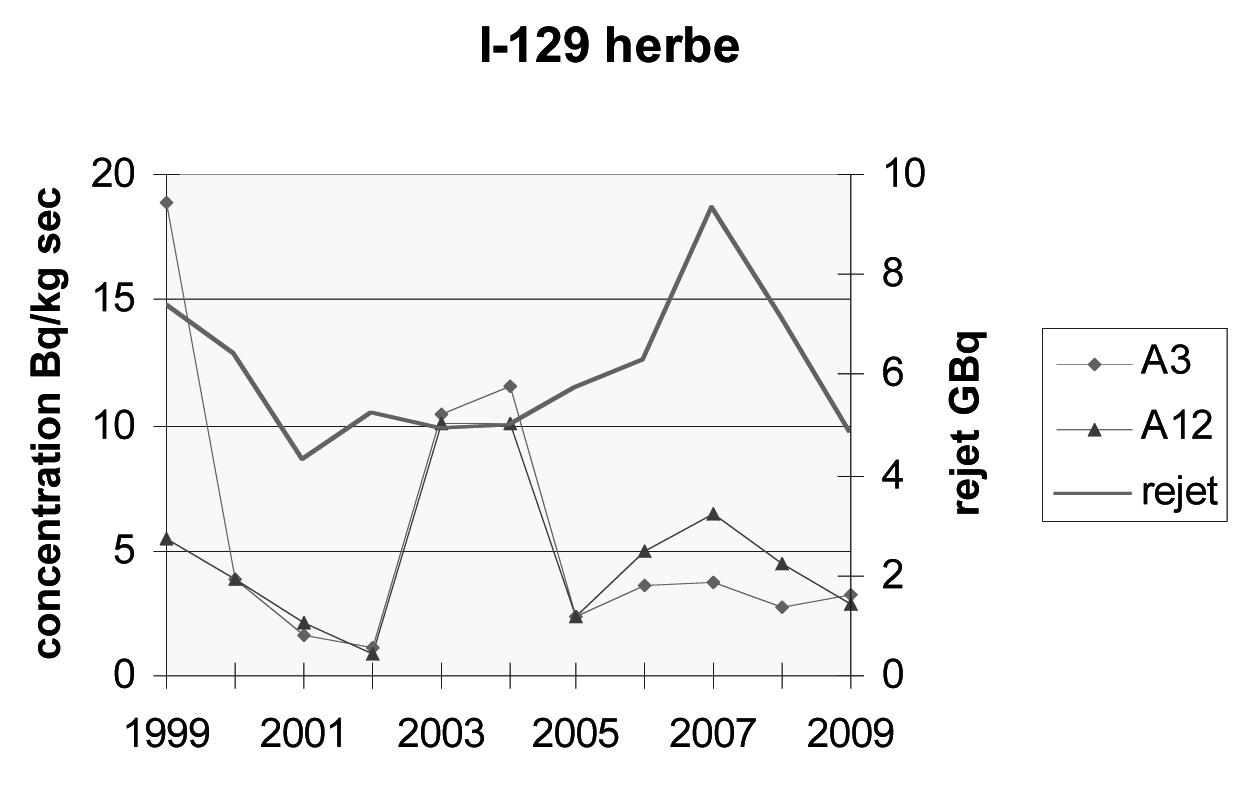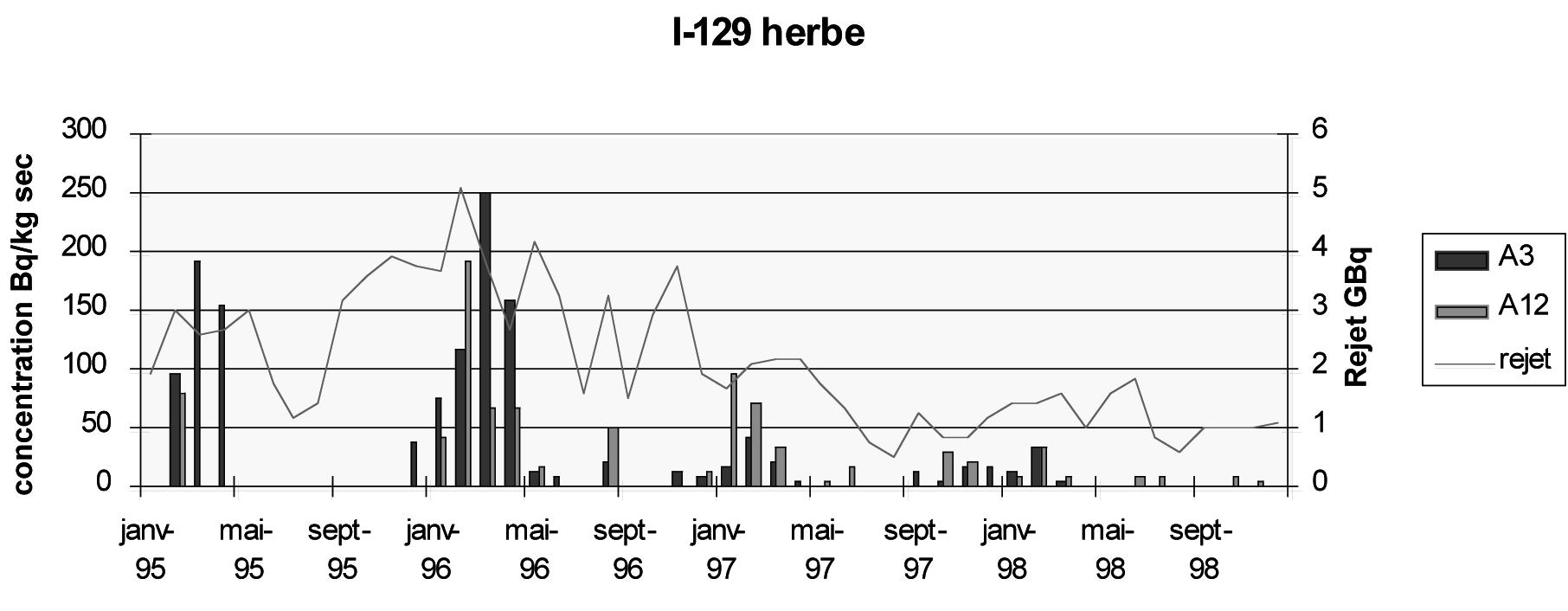 différentes et sur des espèces de mousses et lichens différentes: (suite)CRIIRAD, 1995, Bryum argenteum, mousse terrestre (1.300 fois le taux d’129I dans la zone interdite de Tchernobyl, 42 à 79 mBq/kgsec [CRIIRAD, 1995]), 22,4 à 102,5 Bq/kgsec ACRO, 1998, Homalothecium sericeum, mousse terrestre, 21 à 99 Bq/kgsec ACRO, 2008, Ramalina silicosa, lichen, 2,8 à 15,1 Bq/kgsec Les taux très élevés d’129I relevés par la CRIIRAD et par l’ACRO en 1995 et 1998 peuvent être induits par les rejets atmosphériques maximaux de cette époque (Fig. n°10). Ces trois études donnent des résultats relativement constants pour le site d’Herqueville 22,4 Bq/kgsec (1995), 21 Bq/kgsec (1998), 15,1 Bq/kgsec (2008). Le site Es Clerges de Digulleville étant à 57,5 Bq/kgsec (1995) et 53 Bq/kgsec (1998), pas de donnée 2008 pour ce point. En 1999, dans le cadre des travaux du Groupe Radioécologie Nord-Cotentin, l’exploitant de La Hague a communiqué des résultats d’analyse d’129I dans l’herbe prélevée aux points A3 et A12 de 1995 à 1998, note DQSE 99-277 du 26 mars 1999. Les points A3 et A12, sont situés à 1 km de part et d’autre du site, sous les vents dominants. Les données AEREVA NC sont exprimées en Bq/kgfrais, nous les avons converties en Bq/kgsec en prenant la moyenne des rapports Ps/Pf des échantillons 2007-09 = 0,23 pour ces deux points (Fig. n° 12). Figure n°12 ![]() Rejets mensuels et taux d’129I dans l’herbe en A3 et A12 de 1995 à 1998 Source: AREVA NC, cité par [ACRO, 1999b] Les taux d’129I déterminés par la CRIIRAD sur des mousses terrestres prélevées le 14 décembre 1994 sur des sites sous le vent: 102,5 Bq/kgsec à Omonville la Petite, 57,5Bq/kgsec à Digulleville au hameau les Clerges, sont du même ordre de grandeur que les taux d’129I déterminés par AREVA NC dans l’herbe en 1995 aux points A3 (Digulleville) et A12 (Jobourg, «Calais le Mesnil»): 100 à 200 Bq/kgsec. Les taux d’129I déterminés par l’ACRO sur des mousses prélevées le 6 avril 1998 sont de 99 Bq/kgsec à «Calais le Mesnil», correspondant au site A12 du prélèvement d’herbe AREVA NC de mars-avril 1998: 9 Bq/kgsec; et de 40 Bq/kgsec à La Brasserie (Digulleville), correspondant au site A3 du prélèvement d’herbe AREVA NC de mars-avril 1998: 14 Bq/kgsec. Les mousses terrestres de 1998 ont probablement gardé en mémoire les rejets de la période 1995-96 où les taux d’129I dans l’herbe aux points A3 et A12 culminaient à 200-250 Bq/kgsec. |