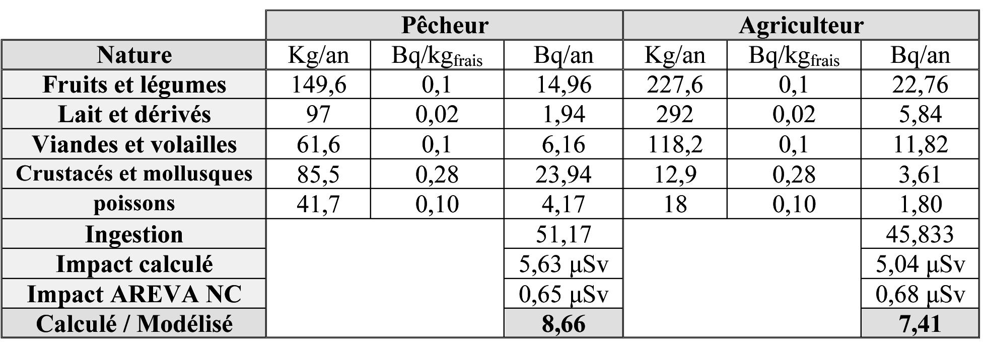 2.5 Impacts locaux, cas du site de La Hague (suite)Sous estimation de la dose «modélisée» A partir des récentes données environnementales fournies dans les rapports AREVA NC 2007 -2009, nous pouvons retenir des contaminations moyennes des productions agricoles, et à partir de la présente étude, de la contamination moyenne des produits marins: Fruits et légumes 0,1 Bq/kgfrais: persil et herbes aromatiques d’Herqueville compris entre 0,1 et 0,8 Bq/kgfrais, Herbe A3 et A12: 0,7 Bq/kgfrais moyenne 2009. Lait et dérivés 0,02 Bq/kgfrais, valeur conservatoire AREVA NC trouvant en 2009 de nombreuses mesures significatives comprises entre 0,02 et 0,05 Bq/l, lait 2009 moyen de «Beaumont» 0,021 Bq/l [IRSN, 2010]. Viandes et volailles 0,1 Bq/kgfrais: quelques données lapin Herqueville 2008 0,2 Bq/kgfrais, œufs Herqueville 0,1 Bq/kgfrais et similitude avec les données fruits et légumes ci-dessus. Crustacés et mollusques 0,28 Bq/kgfrais, données environnementales recueillies dans la présente étude. Fucus serratus 8,4 Bq/kgfrais en moyenne à Goury en 2009. Rapport 30 entre les taux d’129I fucus et faune aquatique → 0,28 Bq/kgfrais, dans la faune aquatique chez les mollusques et crustacés. Poissons 0,1 Bq/kgfrais, 0,11 Bq/kgfrais en moyenne chez les poissons ronds, observés de 2004 à 2009 dans les rapports AREVA NC. En tenant compte de la consommation potentielle de produits locaux pour chaque groupe critique, nous pouvons calculer l’impact de dose efficace pour chaque groupe, en tenant compte du coefficient de dose de la CIPR: 1,1.10-7 Sv/Bq: Tableau n°4 ![]() 129I, Impacts locaux calculés en tenant compte des données environnementales et impacts calculés par modélisation des rejets annuels, Rapport environnement 2009 [AREVA NC 2010] Ces écarts d’un facteur 7 à 8 entre les doses acquises par modélisation et de celles calculées à partir des mesures dans l’environnement avaient été observées dans les rapports du Groupe Radioécologie Nord-Cotentin lors de l’examen critique des rapports environnementaux concernant les rejets des années 2003 à 2006 [GRNC 2005 à 2009]. Pour des rejets relativement stables durant ces 4 années: La prise en compte des mesures dans l’environnement conduisait à des doses nettement supérieures (d’un facteur 5 à 20) aux doses calculées directement à partir du rejet (modélisation). |