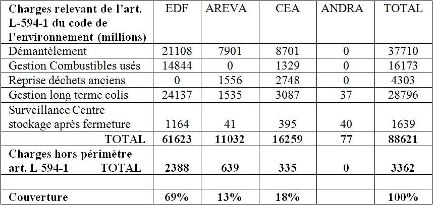 La CNEF doit évaluer le contrôle mené par l’Autorité Administrative envers les exploitants nucléaires. Elle a été prévue dans la loi du 28 juin 2005, mais sa réunion constitutive date du 7 juin 2011 d’où les retards importants de la publication de son rapport. Sa composition est mixte: personnalités qualifiées et parlementaires. 1-Présentation de l’Autorité Administrative L’Autorité administrative est la DGEC (Direction Générale de l’Energie et du Climat), chargée d’évaluer le respect par les exploitants de leurs obligations. La DGEC peut exercer un contrôle coercitif, en cas d’insuffisance ou d’inadéquation en prescrivant des mesures pour régulariser. La DGEC peut, en cas de non exécution dans les délais, émettre un ordre de constitution des actifs sous astreinte, et peut alors, si nécessaire imposer à l’exploitant de verser ses actifs à l’ANDRA. Elle peut aussi prononcer une sanction pécuniaire. Les exploitants ont obligation de communiquer: - leurs rapports triennaux (2 depuis 2006: 2007 et 2010), - Leurs notes d’actualisation (4 depuis 2006: 2008, 2009, 2011, 2012), - Leurs inventaires trimestriels des actifs côtés, - Toutes autres pièces justificatives sur demande Par ailleurs la DGEC doit solliciter annuellement des expertises externes : ASN (depuis 2008), ASND (depuis 2010) et le Corps de contrôle des assurances (entre 2009 et 2012). Elle doit aussi préparer un programme d’audit. 2-Evaluation des passifs Les périmètres considérés sont ceux des INB, INBS non exploités directement par l’Etat: - 125 INB donc 58 pour EDF, 35 pour le CEA, 8 pour AREVA NC - 7 INBS dont 4 pour le CEA, 2 pour AREVA NC Les charges futures sont relatives aux opérations dites de long terme: - démantèlement, - gestion des combustibles usés, - reprise et conditionnement de déchets anciens, - gestion à long terme des colis de déchets radioactifs, - surveillance des centre de stockage après fermeture. Evaluation