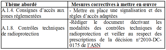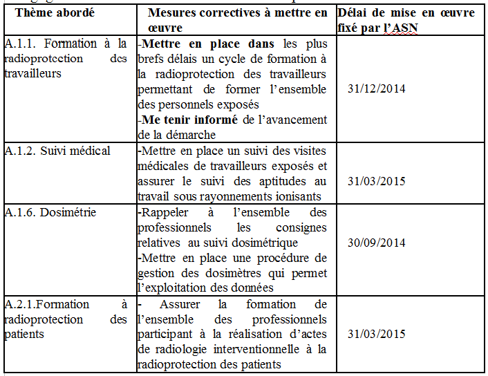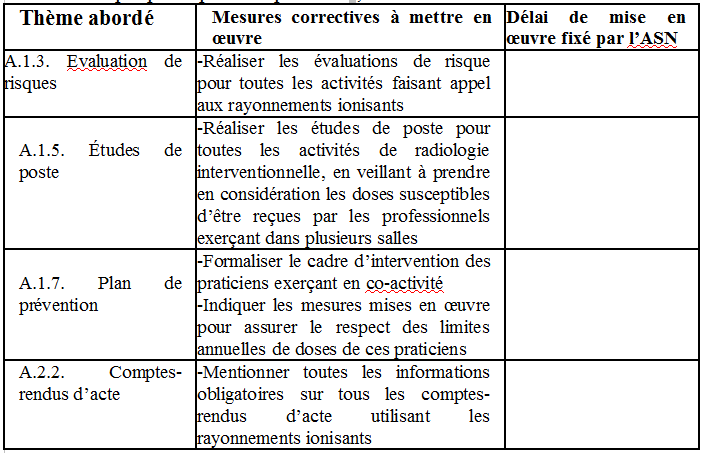 rayonnements ionisants est globalement très insuffisant: p.3045% des paramédicaux exposés aux rayonnements ionisants n’ont pas bénéficié d’une visite depuis 2 ans; 70% des praticiens classés n’ont pas bénéficié d’un suivi médical conforme aux dispositions réglementaires: 30% des praticiens exposés n’ont jamais eu de visite médicale, 15% ont été convoqués, mais ne se sont pas rendus au rendez-vous et 25% ont bénéficié d’une visite datant de plus de 2 ans (dont la moitié antérieure à 2010). A.1.2 Je vous demande de mettre en place un suivi des convocations des personnels à la visite médicale de surveillance renforcée et d’assurer le suivi des aptitudes au travail sous rayonnements ionisants. En outre, je vous engage vivement à formaliser l’organisation mise en place en matière de mouvements de personnels internes à l’établissement, da façon à définir précisément les responsabilités des différents acteurs lorsque des travailleurs sont amenés, après un changement d’affectation, à être exposés aux rayonnements ionisants. D’après les déclarations recueillies, les responsabilités sont actuellement partagées entre la direction des ressources humaines, le service de radiophysique et de radioprotection et les cadres de santé. Il s’agit notamment de s’assurer que toute personne devenant exposée aux rayonnements ionisants du fait d’un changement d’affectation bénéficie des mesures de suivi, médical et dosimétrique, appropriées et de la formation à la radioprotection des travailleurs, préalablement à son entrée en zone réglementée. A.1.3 Evaluation des risques - zonage En application des dispositions de l’article R.4451-1 du code du travail, l’employeur doit procéder à une évaluation des risques liés à l’utilisation des rayonnements ionisants. Les documents présentés aux inspecteurs montrent que la démarche relative à l’évaluation des risques est bien engagée pour les salles dédiées mais qu’elle n’a pas débuté pour les blocs opératoires. En outre, il conviendra de retenir les hypothèses les plus pénalisantes et de préciser les hypothèses de calcul dans les documents relatifs aux évaluations de risques. A.1.3 Je vous demande de réaliser les évaluations de risques pour toutes les activités de l’établissement faisant appel aux rayonnements ionisants. Vous veillerez à prendre en compte les conditions d’activité les plus pénalisantes et à préciser vos hypothèses de calcul. A.1.4 Consignes d’accès aux zones réglementées Conformément aux articles R.4451-18 à R.4451-23 du code du travail et à l’arrêté du 15 mai 2006 relatif aux conditions de délimitation et de signalisation des zones surveillées et contrôlées, le chef d’établissement doit s’assurer que les sources de rayonnements ionisants et les zones réglementées sont convenablement signalées, et que ces dernières sont clairement délimitées. Lors de la visite des salles dédiées du bâtiment Larrey, il a été constaté qu’une signalisation lumineuse et un trèfle matérialisant le risque sont présents sur les portes des différentes salles mais que les consignes d’accès ne sont pas affichées avant l’accès en zone contrôlée. A.1.4 Je vous demande de mettre en place une signalisation et des règles d’accès adaptées, permettant d’éviter toute entrée par inadvertance en zone réglementée. A.1.5 Etudes de postes L’article R.4451-11 du code du travail stipule que l’employeur doit procéder à des études de postes. Ces analyses consistent à mesurer et analyser les doses de rayonnement effectivement reçues au cours d’une opération afin de déterminer la dose susceptible d’être reçue par un travailleur dans une année. Les articles R.4451-44 à R.4451-46 du code du travail déterminent les conditions dans lesquelles s’effectue le classement des travailleurs en fonction du résultat des analyses de postes. Les documents remis aux inspecteurs montrent que les analyses de poste ont été engagées pour les salles dédiées, en réalisant les évaluations de doses susceptibles d’être reçues dans chacune des salles. Cependant, elles doivent être finalisées pour prendre en compte, notamment, la dose susceptible d’être reçue par les professionnels exerçant dans plusieurs salles, ainsi que les doses au cristallin. Par ailleurs, les analyses de poste doivent être conduites pour toutes les activités de radiologie interventionnelle, en particulier celles réalisées dans les blocs opératoires. A.1.5 Je vous demande de réaliser les études de poste pour toutes les spécialités de radiologie interventionnelle, en veillant à prendre en considération les doses susceptibles d’être reçues par les professionnels exerçant dans plusieurs salles présentant un risque d’exposition aux rayonnements ionisants. |