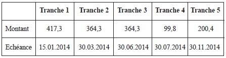 Article 2 p.28Modification du point 1.3 de la convention Au premier alinéa du point 1.3 de la convention: - les termes: «1.328,1 M €» sont remplacés par les termes: «1.446,1 M €»; - les termes: «loi de finances pour 2014» sont remplacés par les termes: «la loi n°2013-1278 du 29 décembre 2013 telle que modifiée par la loi de finances rectificative pour 2014». Le tableau 1 est remplacé par le tableau suivant: Au troisième alinéa, les termes: «1, 2 et 3» sont remplacés par les termes: «1, 2, 3 et 4». Au dernier alinéa, les termes: «tranche 4» sont remplacés par les termes: «tranche 5». Article 3 Modification du point 2.3 de la convention Au quatrième alinéa du point 2.3, second tiret, les termes: «tranche 4» sont remplacés par les termes «tranche 5». Article 4 Modification du point 3.1 de la convention Dans le tableau n° 2 de la convention, les termes: «1.328.100.000» sont remplacés par les termes: «1.446.100.000». Article 5 Modification de l’article 5 de la convention À l’article 5, les termes: «tranches 1 à 3» sont remplacés par les termes: «tranches 1 à 4» et les termes: «(tranche 4)» sont remplacés par les termes: «(tranche 5)». Article 6 Entrée en vigueur de l’avenant Toutes les autres dispositions de la convention demeurent inchangées. L’avenant entre en vigueur le jour de sa publication au Journal officiel de la République française. Il demeure en vigueur jusqu’au terme de la convention. Fait à Paris, le 30 juillet 2014, en trois exemplaires. Pour l’Etat: Le Premier ministre, Pour le Premier ministre et par délégation: Le commissaire général adjoint, T. Francq Le ministre de la défense, Jean-Yves Le Drian Pour le Commissariat à l’énergie atomique et aux énergies alternatives: L’administrateur général, Bernard Bigot |