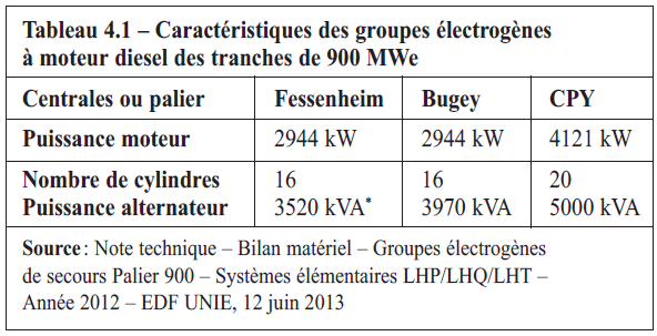 Introduction (suite)Une centrale nucléaire doit toujours être alimentée en électricité afin d’assurer les fonctions élémentaires de sûreté, avec principalement le contrôle et le refroidissement du cœur de réacteur en toutes circonstances. En situation normale, la centrale est connectée au réseau électrique national par l’intermédiaire des lignes principales à très haute tension (400.000 volts) et elle est également raccordée à une ligne auxiliaire. En cas de perte du réseau électrique national, le site doit être autonome en électricité. Pour cela les installations nucléaires sont équipées de puissants groupes électrogènes de secours à moteur diesel. En cas de perte des alimentations électriques délivrées par le réseau national, les groupes électrogènes prennent le relais. Mais s’ils tombent en panne c’est la catastrophe, les systèmes de sauvegarde ne fonctionnent plus: c’est ce qui c’est passé à Fukushima. Lors de la construction, chaque réacteur a été équipé de deux groupes électrogènes (GE) à moteur diesel. Un seul suffit à secourir en électricité le réacteur. Leur nom de baptême «LHG» et «LHH» pour Bugey, «LHP» et «LHQ» pour les autres tranches de 900 MWe. À Fessenheim, les quatre groupes ont la même dénomination «LHG». Comme nous n’avons pas une confiance absolue dans leur fiabilité, un secours des secours est prévu. C’est le «LHT» ou «GUS» pour groupe d’ultime secours*. Chaque site possède un GUS commun à plusieurs tranches, mais il ne démarre pas automatiquement comme les groupes électrogènes principaux. Il est nécessaire d’établir manuellement les connections électriques avant de pouvoir alimenter la tranche en avarie. L’alimentation électrique d’un réacteur paraît donc robuste avec deux alimentations externes (lignes principale et auxiliaire) et trois alimentations internes, les deux groupes électrogènes principaux et le groupe d’ultime secours. On a tellement confiance dans cette organisation qu’un secours de l’ultime secours a été prévu en cas de perte totale des alimentations électriques (externes et internes). On ne sait jamais ce qu’il peut arriver. Il s’agit cette fois d’un petit turbo-alternateur de secours alimenté par de la vapeur de récupération des générateurs de vapeur. Son petit nom c’est «LLS». Il est utilisé en situation accidentelle et il sera l’objet du chapitre suivant. Groupes électrogènes Le moteur des groupes électrogènes de secours est constitué de 16 à 20 cylindres en V qui sont alimentés en diesel par l’intermédiaire d’un turbocompresseur. L’alternateur couplé au moteur permet de produire l’électricité des organes de sauvegarde de la centrale. La puissance délivrée par l’alternateur est de l’ordre de quelques mégawatts. L’ensemble moteur-alternateur est appelé groupe électrogène. Le tableau 4.1 détaille les caractéristiques des groupes électrogènes de secours équipant les centrales nucléaires de 900 MWe. Lors de la perte des alimentations électriques externes, les auxiliaires de sauvegarde sont perdus. Les groupes électrogènes sont alors chargés d’alimenter en énergie électrique ces organes de sauvegarde. Les groupes électrogènes sont donc primordiaux pour assurer la sûreté des installations. Ils ne servent pas souvent mais on doit pouvoir absolument compter sur eux. C’est pourquoi ils sont régulièrement essayés par l’exploitant afin d’en vérifier le bon fonctionnement. Il peut arriver qu’une défaillance matérielle provoque la panne d’un groupe électrogène, ce qui n’est pas rare. On parle de fonction sûreté dégradée lorsqu’un des deux groupes électrogènes devient indisponible. Au fil du temps, EDF a plus ou moins bien fiabilisé le fonctionnement de ces matériels de secours. Mais en 2010, de nouveaux problèmes émergent. Explications d’EDF: «Jusqu’en 2010, le parc des moteurs des tranches 900 MWe connaissait une avarie grave nécessitant un échange standard du moteur tous les 3 ans en moyenne. Notre stock dimensionné alors à 3 moteurs couvrait sans problème ce risque. (...). L’année 2010 est une année que l’on peut juger exceptionnelle avec 4 avaries graves» de groupe électrogène de secours à moteur diesel. Ces informations sont issues des éléments de réponse que l’exploitant a apportés à l’ASN suite à «l’événement de niveau 2 sur l’échelle INES concernant les groupes électrogènes de secours à moteur diesel» de Tricastin. Que s’est-il donc passé? |