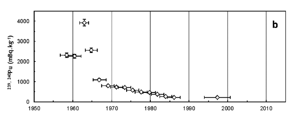 concentrations en 238Pu (a) et 239, 240Pu (b) et du rapport d’activité
