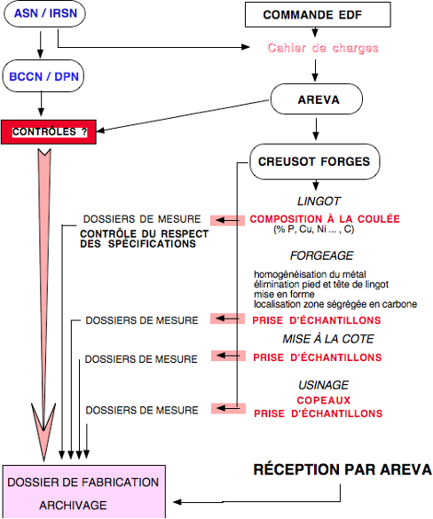 Je sens qu’on va revenir aux grands cris de l’époque du «père» Combes: À bas la calotte!!! (suite)Reprenons la chronologie des événements: 2006-20..: Creusot-Forges coule les lingots destinés à façonner les calottes promises à la fonction de fond de cuve et à celle, plus glorieuse de couvercle. Ils font ce qu’ils savent encore faire, mais en l’occurrence, ce ne sont pas les dernières techniques élaborées, en particulier, par les Japonais. La qualité du lingot dépend de son refroidissement: les Japonais utilisent la meilleure méthode soit un suivi strict de la température. Ensuite ils forgent, tous petits travaux destinés à donner une forme plus utilisable, mais également ces grands «coups de marteau» vont servir à homogénéiser les veines de ségrégations qui se forment inéluctablement lors du refroidissement d’une masse énorme de métal en fusion. Puis ils coupent ce qui dépasse... etc. Lors de ces opérations, l’industriel doit prendre des échantillons pour faire des analyses, faire des contrôles multiples pour s’assurer qu’à ce niveau du travail, le cahier de charge est bien respecté (composition de l’acier et le moins de ségrégations possibles). DAMNED!!! Il s’avère que ce n’est pas conforme aux spécifications... alors que faire? On rebute ce bébé de 200 tonnes, on recommence... ou on continue en se disant que, comme l’ont pensé les ingénieurs de VW... ils ne verront rien. Les Américains, avec le mauvais esprit qu’on leur connaît (Concorde, l’Airbus destiné à l’US Air Force...) et leur philosophie de protection de leur industrie, envoient une mission de la NRC visiter Creusot –Forges en 2009. Leur rapport... boff, en termes polis, prudents, ils y disent que c’est possiblement de la m... Quant au suivi du refroidissement d’un lingot et de la question de thermocouples AREVA dit: «c’est trop chaud,, ils vont fondre» et les pyromètres optiques, ils sont faits pour... la NRC? Justement la NRC a relevé leur mauvais fonctionnement d’où la réponse AREVA: on va les régler... Maintenant se situe un épisode loufoque. L’ASN découvre (ou dit découvrir) plusieurs années plus tard (2013) ce rapport. C’est surréaliste; Une mission d’enquête de la NRC vient fouiner sur un site industriel sensible - Creusot-Forges - sans que leurs homologues de l’ASN ne soient ni informés, ni avisés!!! Heureusement que ce n’était pas une mission d’inspection de l’EI! Pendant tout ce temps, AREVA continue le travail... Dans une logique industrielle bien rodée, le schéma des contrôles devrait être approximativement celui présenté ci-après: Mais comme le dit si bien Pierre-Franck Chevet: tout a failli dans ce contrôle de chantier. D’ailleurs rappelons-nous qu’il y a 20 ans nos inspecteurs du BCCN (Bureau de Contrôle des Chaudières Nucléaires) se déplaçaient jusqu’au Japon pour contrôler la fabrication de lingots creux (par ex viroles de Golfech): il est vrai que se déplacer au Japon était alors plus motivant, que d’aller aux forges du Creusot!!! En bons professionnels, ils ont dû effectuer les prises d’échantillons, les diverses mesures, constituer des rapports à toutes les étapes et archiver le tout. Mais les conclusions ont-elles été lues? analysées? et si j’osais, prises en compte??? |
