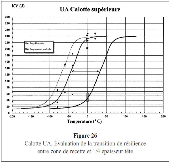 (suite)Les mesures réalisées dans les zones suspectes (de la pièce sacrificielle) ont révélé des valeurs de résilience insuffisantes pour satisfaire le premier niveau de défense vis-à-vis de la sûreté. Rappelons les principes des deux premiers niveaux de défense. 1. Le premier niveau de défense a pour objet de prévenir les incidents. 2. Le deuxième niveau de défense a pour objet de détecter la survenue de tels incidents et de mettre en oeuvre les actions permettant, d’une part, d’empêcher que ceux-ci ne conduisent à un accident et, d’autre part, de rétablir une situation de fonctionnement normal ou, à défaut, d’atteindre puis de maintenir le réacteur dans un état sûr. On se limitera à signaler un point de règlement résultant de ces principes. Un acier est considéré comme suffisamment ductile pour satisfaire au niveau 1 de sûreté nucléaire (pour l’acier qui nous concerne) si son allongement après rupture dans un test de traction réalisé selon une procédure standard est au moins égal à 20% et si son énergie de flexion par choc sur éprouvette ISO V à 0°C est au moins égal à 60 Joules... Les valeurs de résilience mesurées dans les zones suspectes jusqu’ici considérées (mais le rapporteur en a identifié d’autres) présentent une valeur moyenne de 52 Joules et une valeur minimale de 36 joules. Elles ne satisfont pas au niveau de 1 de sûreté nucléaire spécifiant une résilience minimale de 60 joules. De plus, elles sont très largement inférieures à ce qu’on aurait pu espérer du matériau s’il avait été conforme à la zone de recette (vue sur la figure 26) pour une résilience attendue de 220 joules. Il n’a pas été évoqué, au cours de la réunion, si le critère d’allongement à rupture en traction était satisfait, mais c’est indiqué dans le rapport (page 25). De même que cela est requis par suite du vieillissement des aciers sous bombardement neutronique, il faudrait augmenter les températures de référence (pertinentes vis-à-vis de la sûreté de niveau 1) du décalage en température permettant de rattraper la faiblesse de résilience due à la ségrégation. Ce serait toutefois impossible pour certains chargements accidentels. Cette option, évoquée par AREVA, conduirait à une valeur qui pourrait raisonnablement être fixée à 30°C (ce point est discuté dans les annexes 4 et 5 du rapport de l’ASN, page 74) en s’inspirant de la figure 26 (ci-dessus) sachant qu’il faudrait plutôt appliquer un décalage de 70°C pour retrouver les marges de sécurité initiales - approche qualifiée, à juste titre, de plus conservative. |
