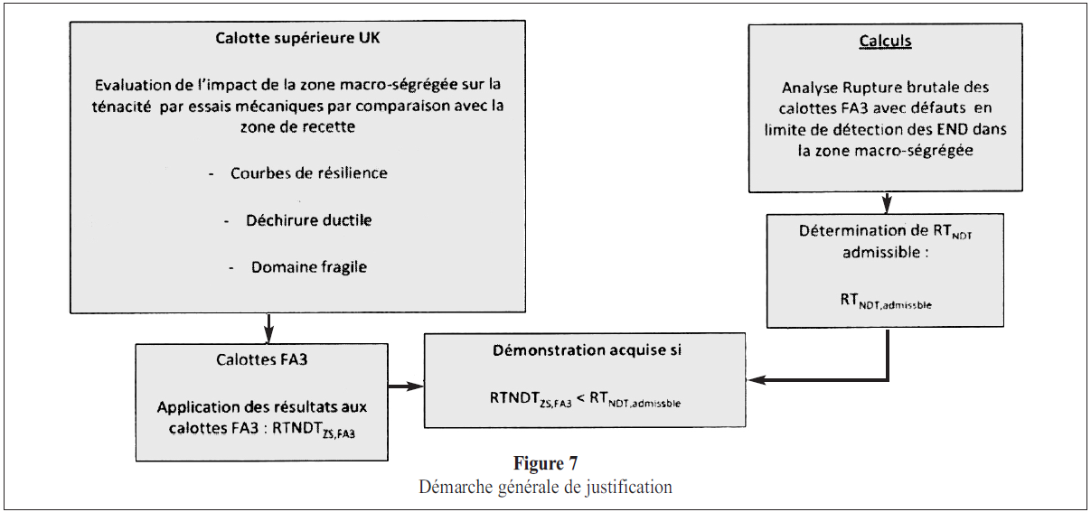 (suite)1. La détermination (par calculs) d’une ténacité suffisante pour prévenir le risque de rupture brutale; 2. L’évaluation (par essais) de la ténacité minimale dans la zone de ségrégation majeure positive du matériau; 3. La comparaison de la ténacité minimale du matériau à la ténacité suffisante. Pour ce qui concerne la détermination de la ténacité suffisante, le rapporteur souligne que celle-ci a été définie dans le dossier d’AREVA sur la base d’une liste de situations de fonctionnement, qui n’a pas pu faire l’objet d’une analyse dans le cadre de ce rapport compte tenu de la date tardive de transmission des éléments, en retenant une hypothèse fondamentale: AREVA considère que la ségrégation majeure positive est située en peau externe des calottes fabriquées et limite par conséquent son analyse du risque de rupture brutale à des défauts situés en peau externe. AREVA en déduit qu’il n’est pas nécessaire d’étudier les situations de chocs froids, uniquement susceptibles de solliciter des défauts situés en peau interne. Le rapporteur note que le programme d’essais prévoit des essais à mi-épaisseur, ce qui est de nature à valider cette hypothèse fondamentale du dossier d’AREVA. Enfin, le rapporteur souligne que le caractère exhaustif et enveloppe des situations de fonctionnement sera analysé ultérieurement. Pour ce qui concerne l’évaluation de la ténacité minimale par des essais, le rapporteur note que le programme d’essais a été notablement révisé par AREVA au cours de l’instruction. En particulier, le positionnement des éprouvettes sera optimisé suivant les résultats de la cartographie chimique réalisée par spectrométrie en surface des tranches découpées à différentes profondeurs de la calotte (1⁄4 épaisseur et 1⁄2 épaisseur) destinées aux essais mécaniques : cette disposition est de nature à obtenir des résultats d’essais dans les zones présentant la teneur en carbone la plus élevée. Le programme d’essais sera finalement réalisé sur deux calottes (une calotte supérieure du projet UK et une calotte inférieure du projet UA), ce qui permettra d’apprécier l’étendue et la profondeur de la zone ségrégée dans ces deux calottes dont les épaisseurs usinées sont différentes. Par ailleurs, le rapporteur considère que des mesures de propriétés mécaniques sur une calotte provenant d’une coulée différente de la calotte supérieure UK sont de nature à améliorer la confiance dans les résultats obtenus. Pour ce qui concerne la comparaison de la ténacité minimale du matériau à la ténacité suffisante, le rapporteur souligne que la démarche d’AREVA diffère selon les situations de fonctionnement: * Pour les épreuves hydrauliques, AREVA propose de positionner les valeurs de ténacité mesurées dans la zone ségrégée, issues des résultats du programme d’essais, au regard de la courbe ZG 6110 du RCC-M, indexée sur trois températures de référence distinctes, considérées successivement. La comparaison consiste à vérifier que les valeurs de ténacité mesurées sont supérieures aux valeurs de la courbe indexée et que la ténacité minimale, déduite de la courbe à la température d’épreuve, est supérieure à la ténacité suffisante. Le rapporteur considère que seule la démarche basée sur une indexation de la courbe sur la RTNDT mesurée dans la zone de ségrégation majeure positive est acceptable; * Pour les situations de fonctionnement de la démonstration de sûreté, AREVA propose de vérifier un critère de résilience à 1⁄2 épaisseur afin de valider l’hypothèse retenue pour la sélection des situations limitatives. Toutefois, en fin d’instruction, AREVA a indiqué que dans le cas où la résilience mesurée à mi-épaisseur ne respecterait pas le critère retenu, les mesures de ténacité également prévues à mi-épaisseur lui permettraient de démontrer que la ténacité du matériau y est suffisante. Le rapporteur souligne que ceci remet en cause la définition de la ténacité suffisante proposée par AREVA et donc la démarche de justification associée. |