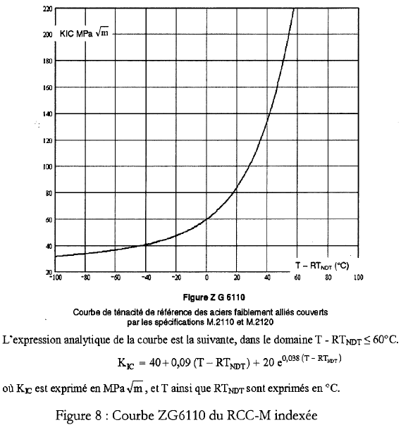 p.13Sa démarche est axée sur la prévention du risque de rupture brutale. Avant de l’aborder, signalons qu’AREVA considère que la présence de ségrégations majeures positives ne remet pas en cause la prévention des dommages d’instabilité plastique des calottes de cuve... du fait de la résistance à la traction plus élevée dans ces zones. Mais que dire – a contrario – des zones de ségrégations majeures négatives inévitablement présentes pour équilibrer la proportion de carbone initiale. La limite élastique n’y serait-elle pas trop basse? La démarche proposée par AREVA semble très logique (page 31 du rapport): 1- La détermination (par calculs) d’une ténacité suffisante pour prévenir le risque de rupture brutale, 2- L’évaluation (par essais) de la ténacité minimale dans la zone de ségrégations majeures positives du matériau, 3- La comparaison des deux valeurs. Pour la partie «détermination d’une ténacité suffisante» AREVA retient des tailles de fissures et des cas de charge associés, pour des «situations» de chargement non encore validées par l’ASN. Les valeurs de ténacité résultant de ces calculs sont toujours inférieures aux valeurs calculées pour les chargements d’épreuve, à savoir 60 MPa.m½ pour le fond de cuve et 63,4 MPa.m½ pour le couvercle. On comprend donc que, au cas présent, on souhaite s’assurer que la ténacité mesurée est supérieure à ces valeurs aux températures auxquelles ces chargements sont effectués. Aucune mesure de ténacité n’a pour l’instant été réalisée, mais AREVA propose implicitement d’utiliser la «courbe ZG-610 du RCC-M inversée» représentée sur la figure 8 reproduite plus bas, pour associer aux valeurs de ténacités calculées des décalages de température (décalage de RTNDT admissibles - tableau 12 page 44). Ceci permet de prévoir, pour les épreuves hydrauliques, les températures d’essais. Par exemple, pour le fond de cuve, une température d’épreuve à 50°C serait suffisante. Cette estimation de températures d’essai est sans doute prématurée tant que les mesures de ténacité n’ont pas été effectuées, mais elles permettent de nous préparer à la démarche de justification présentée sur le tableau 7 qui envisage d’utiliser la «courbe ZG-610 du RCC-M inversée» comme médiateur pour comparer les ténacités. |