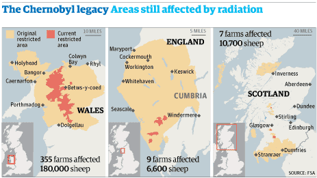 ![]() More than 130,000 people were resettled from the immediate area and experts say there should be no farming there for at least 200 years. The Food Standards Agency said the release of radiocaesium-137 in upland areas of Britain is still able to pass easily from soil to grass and accumulate in sheep. The European Commission imposed a maximum limit of 1,000 becquerels per kilogram (bq/k) of radiocaesium in sheep meat affected by the accident to protect consumers. Under a "mark and release" scheme in the restricted areas, a farmer wishing to move animals out of the area must have them monitored by a hand-held device. "Any sheep that exceed the working action level are marked with dye and are not released from restrictions," said a spokesman, who added that mass summer surveys of sheep are performed at farms where there is confidence that restrictions are no longer needed. Huw Alun Evans's farm, Hengwrt Uchaf in north Wales, is one of the 369 inside one restricted area. Thousands of his sheep have been scanned for more than two decades. Evans's animals have failed radiation tests if they have been on higher ground, but the danger levels drop after they have been brought down to graze on lower pastures. He says: "I remember a meeting with civil servants at the time [1986] and got the impression they thought it would be short-lived. No-one had any idea it would go on this long." Revelations about the continuing impact of the Chernobyl accident come weeks after three different sites were bought in auction by EDF and other power companies for building new atomic plants in Britain. The sites at Bradwell in Essex, Wylfa in Anglesey and Hinkley Point in Somerset were auctioned for £400m by the Nuclear Decommissioning Authority. A similar process is expected to start shortly for land near the huge Sellafield nuclear complex in Cumbria, as the government moves to put in place new electricity generating plants to provide relatively low-carbon power and bolster domestic energy sources at a time when old atomic stations are nearing the end of their lives. |